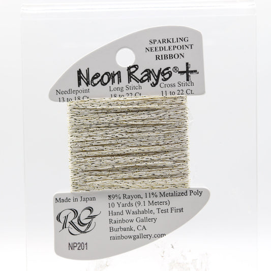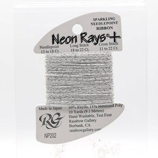 Rainbow Gallery Neon Rays Plus - 202 Silver Sparkle - 202 Silver SparkleThis is Neon Rays Plus from Rainbow Gallery in color 202 Silver Sparkle. A shiny rayon ribbon with hints of sparkles that is excellent for creating metallic and porcelain textures. Works to great effect with long stitches. Use as-is on all sizes. Material: Synthetic...