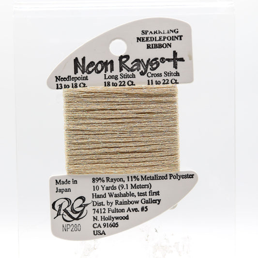 Rainbow Gallery Neon Rays Plus - 280 Sand Gold - 280 Sand GoldThis is Neon Rays Plus from Rainbow Gallery in color 280 Sand Gold. A shiny rayon ribbon with hints of sparkles that is excellent for creating metallic and porcelain textures. Works to great effect with long stitches. Use as-is on all sizes. Material: Synthetic...