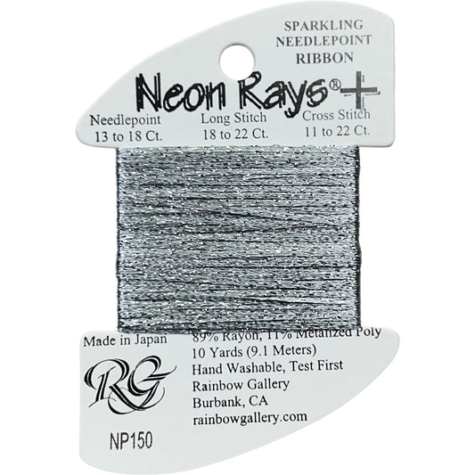 Rainbow Gallery Neon Rays Plus - 150 Platinum - 150 PlatinumThis is Neon Rays Plus from Rainbow Gallery in color 150 Platinum. A shiny rayon ribbon with hints of sparkles that is excellent for creating metallic and porcelain textures. Works to great effect with long stitches. Use as-is on all sizes. Material: Synthetic Metallic...