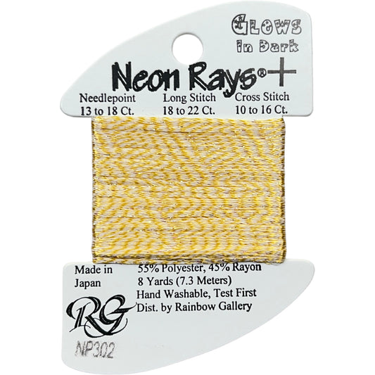 Rainbow Gallery Neon Rays Plus - 302 Yellow Glow in Dark - 302 Yellow Glow in DarkThis is Neon Rays Plus from Rainbow Gallery in color 302 Yellow Glow in Dark. A shiny rayon ribbon with hints of sparkles that is excellent for creating metallic and porcelain textures. Works to great effect with long stitches. Use as-is on all sizes....