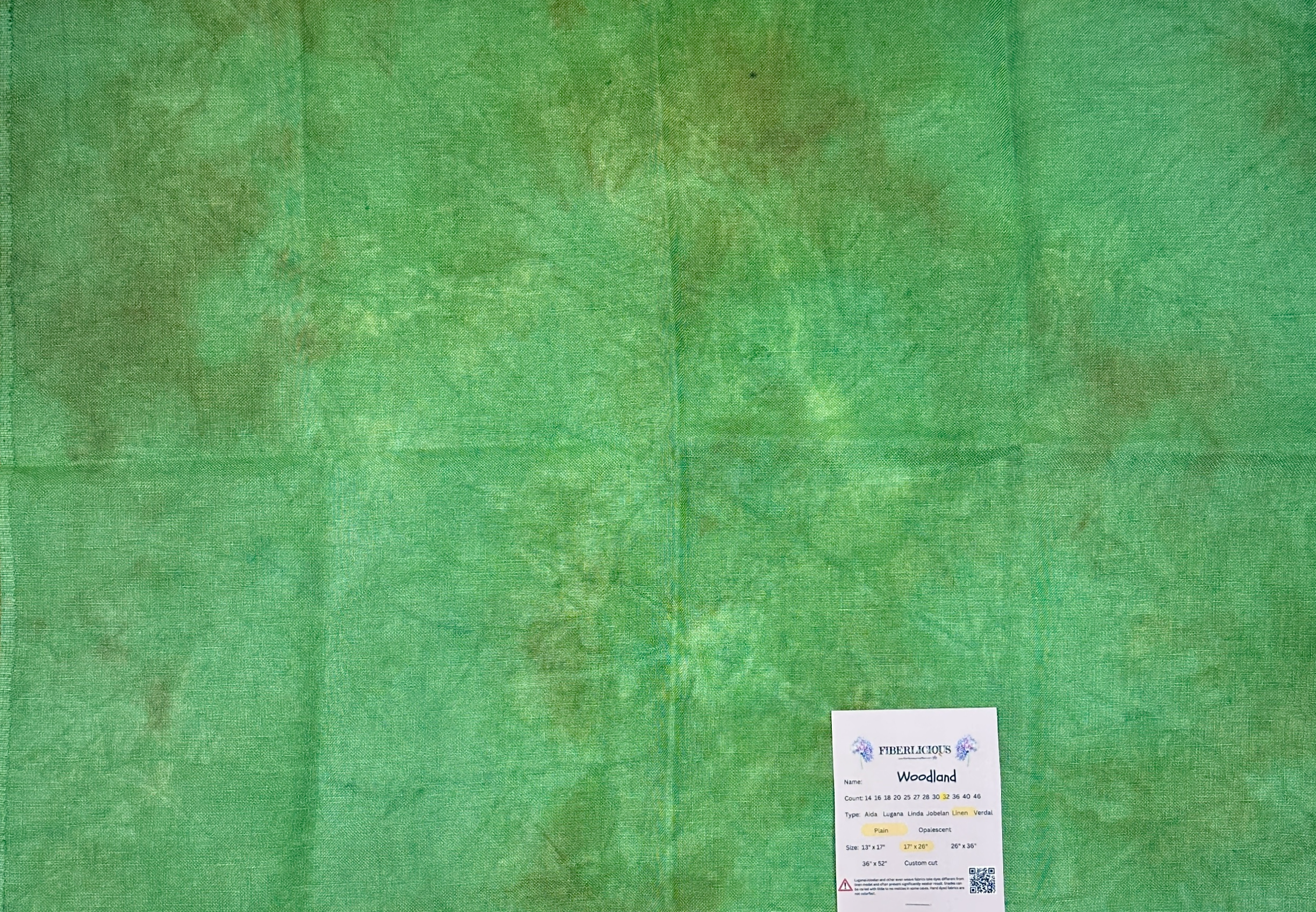 This is hand dyed 32 ct linen cross stitch fabric by Fiberlicious in Woodland. Woodland is a serene and earthy hand-dyed fabric that captures the tranquility of a walk through a lush forest. With a rich blend of mossy greens, earthy browns, and subtle golden highlights, this fabric evokes the beauty of dappled sunlight filtering through dense foliage. Perfect for nature-inspired cross-stitch designs, fairy tales, or woodland-themed patterns, it provides a harmonious and natural backdrop to bring your projects to life. Due to the nature of the hand dying process, variations in color and pattern are to be expected. Edges will be serged.