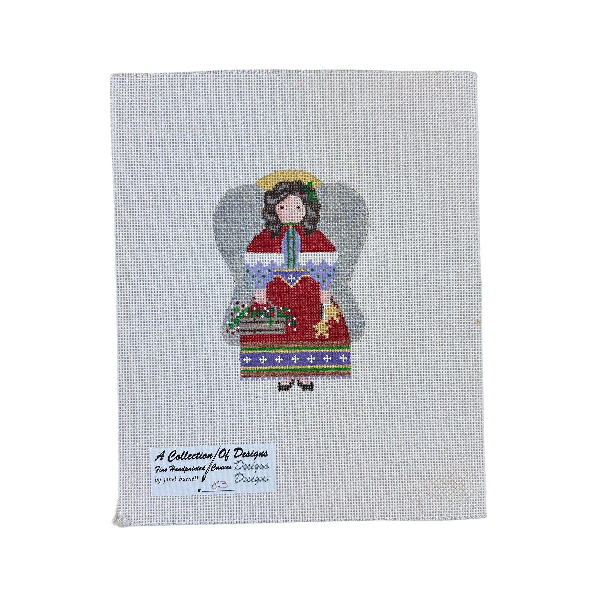 This hand painted needlepoint canvas from A Collection of Designs features a brunette angel with a basket of holly.