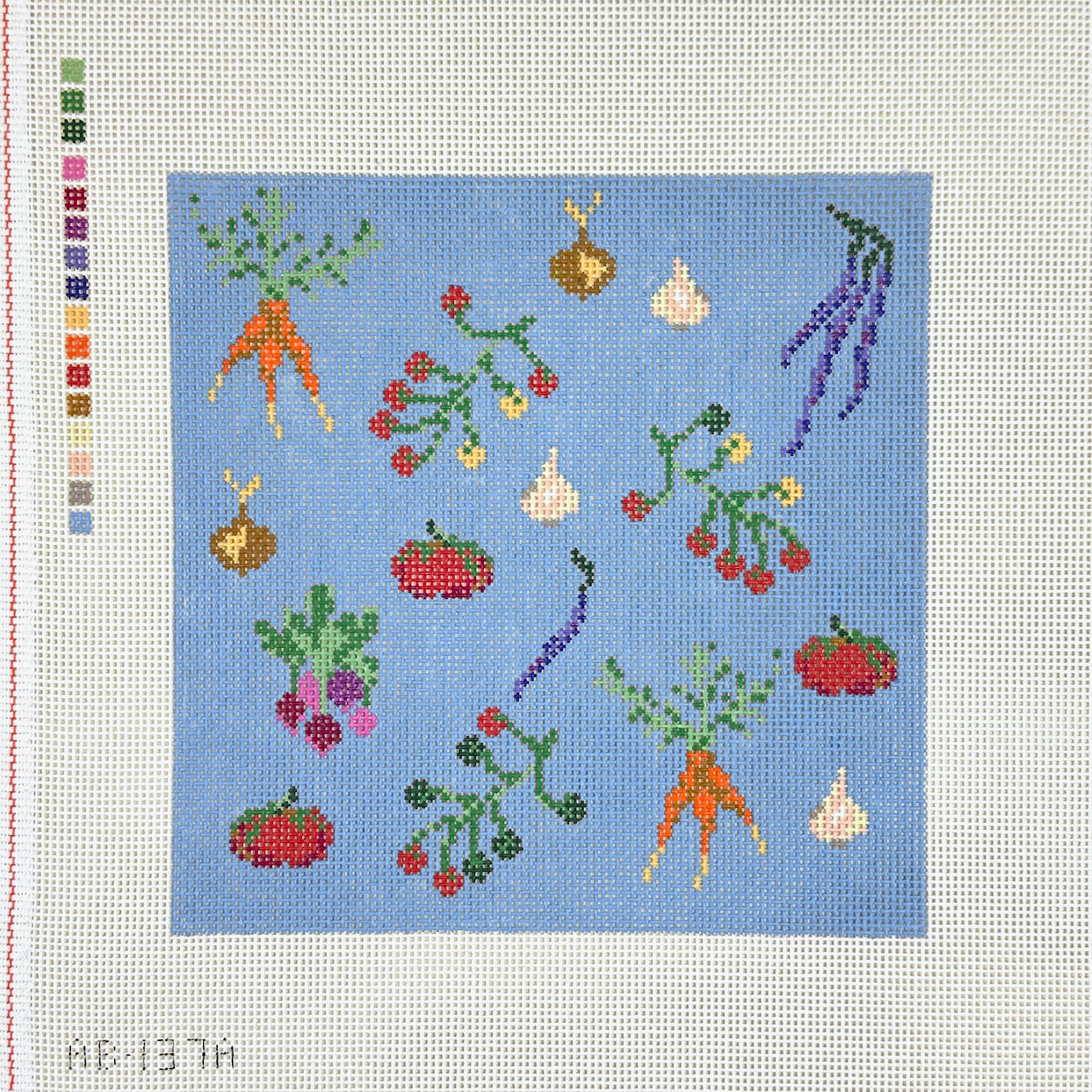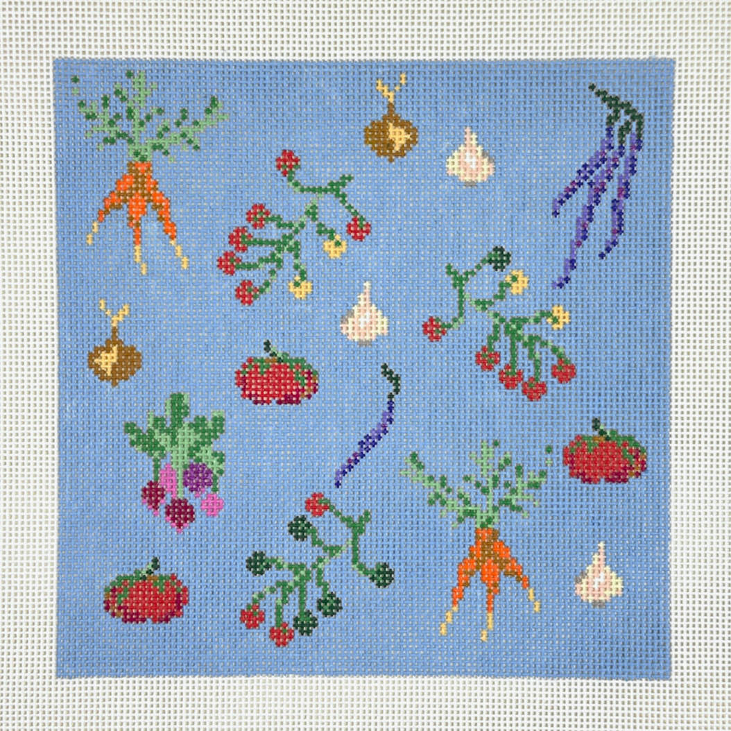This is a hand painted needlepoint canvas by Alice & Blue. It features various vegetables on a bright blue background.