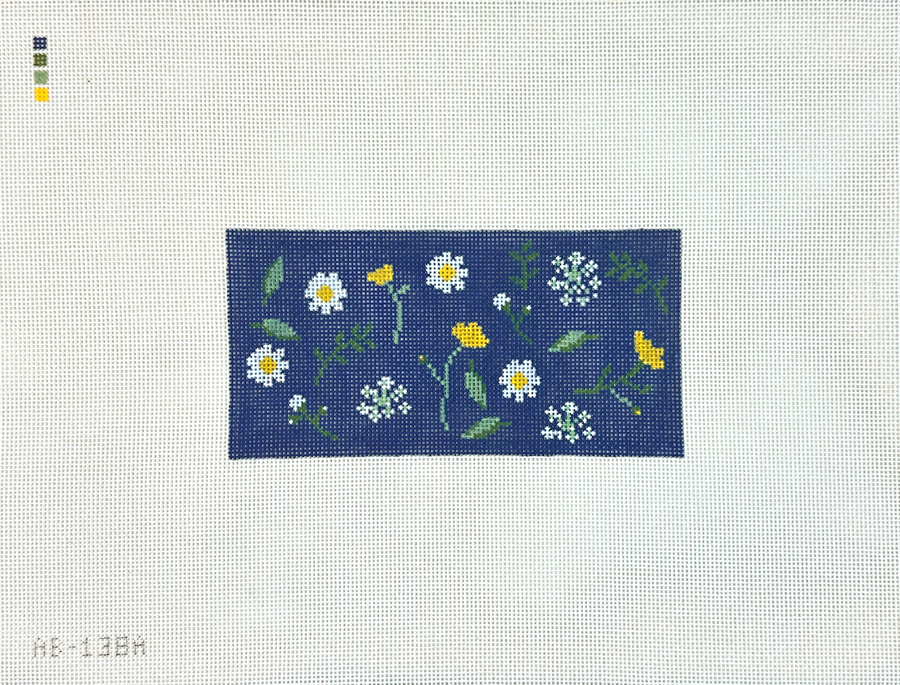 This is a hand painted needlepoint canvas by Alice & Blue. It features pretty yellow and white flowers on a dark blue background.