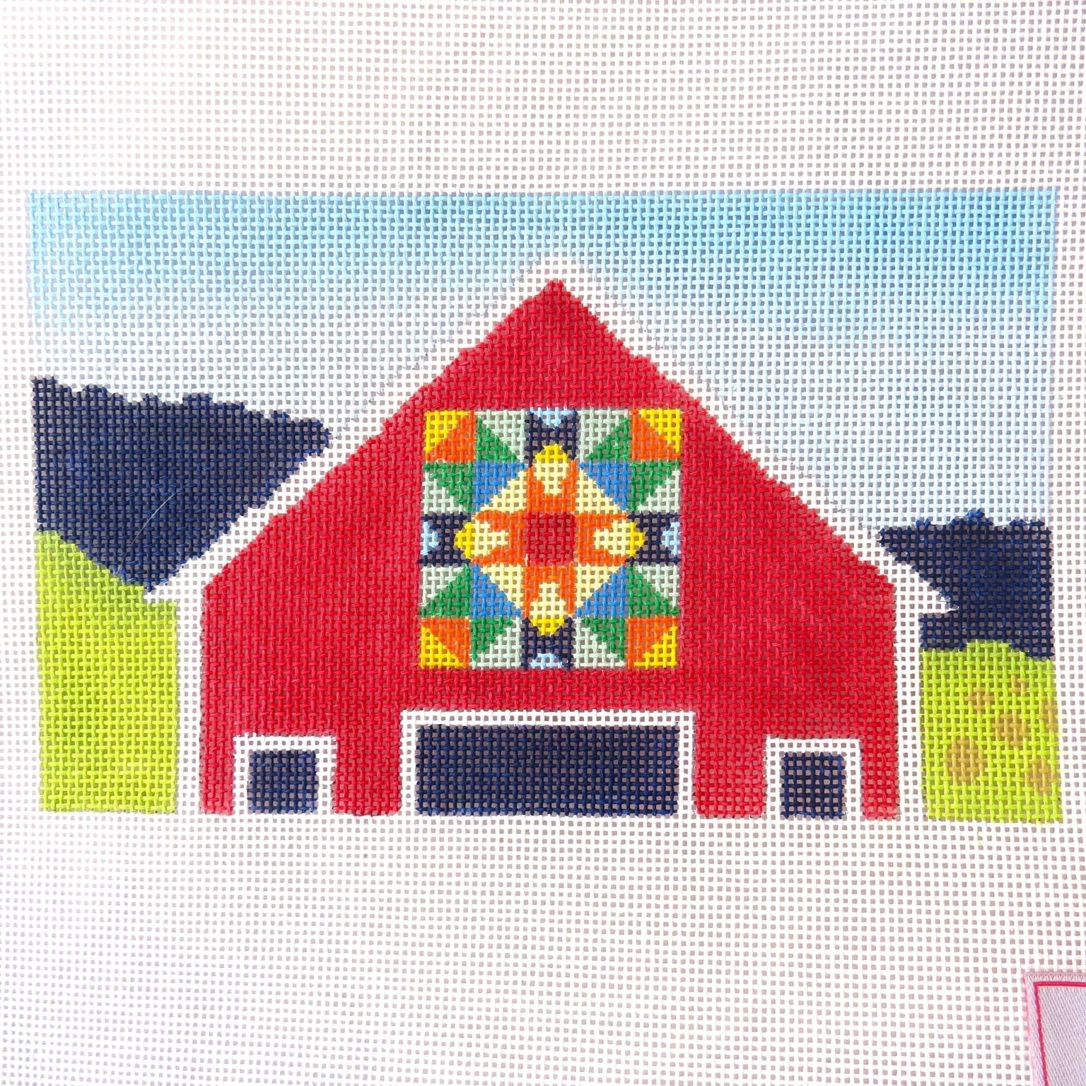 This hand painted needlepoint canvas from Alice & Blue features a landscape with a red barn hung with a colorful barn quilt.