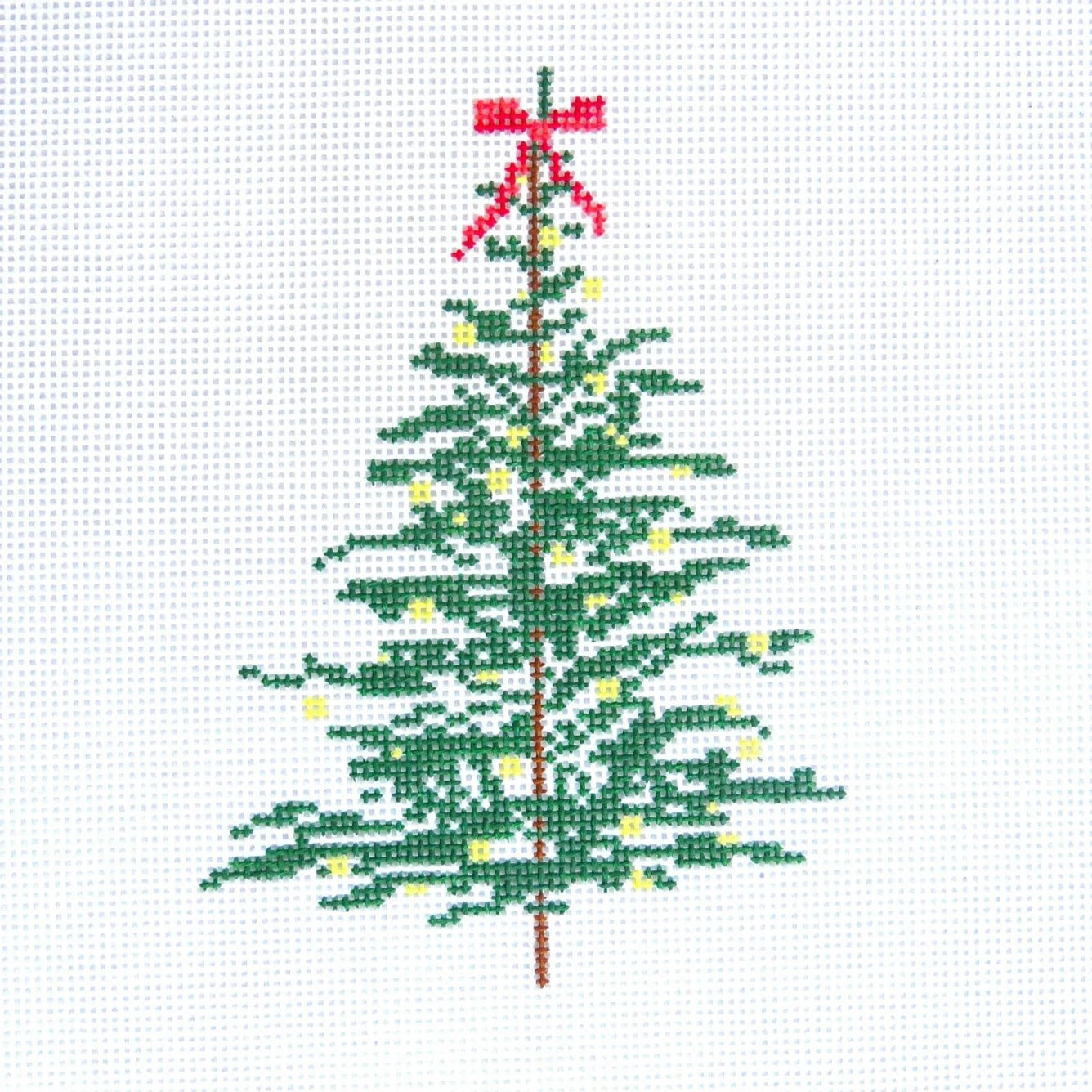 This hand painted needlepoint canvas from Alice & Blue features a simple Christmas tree with twinkling lights a red bow on top.