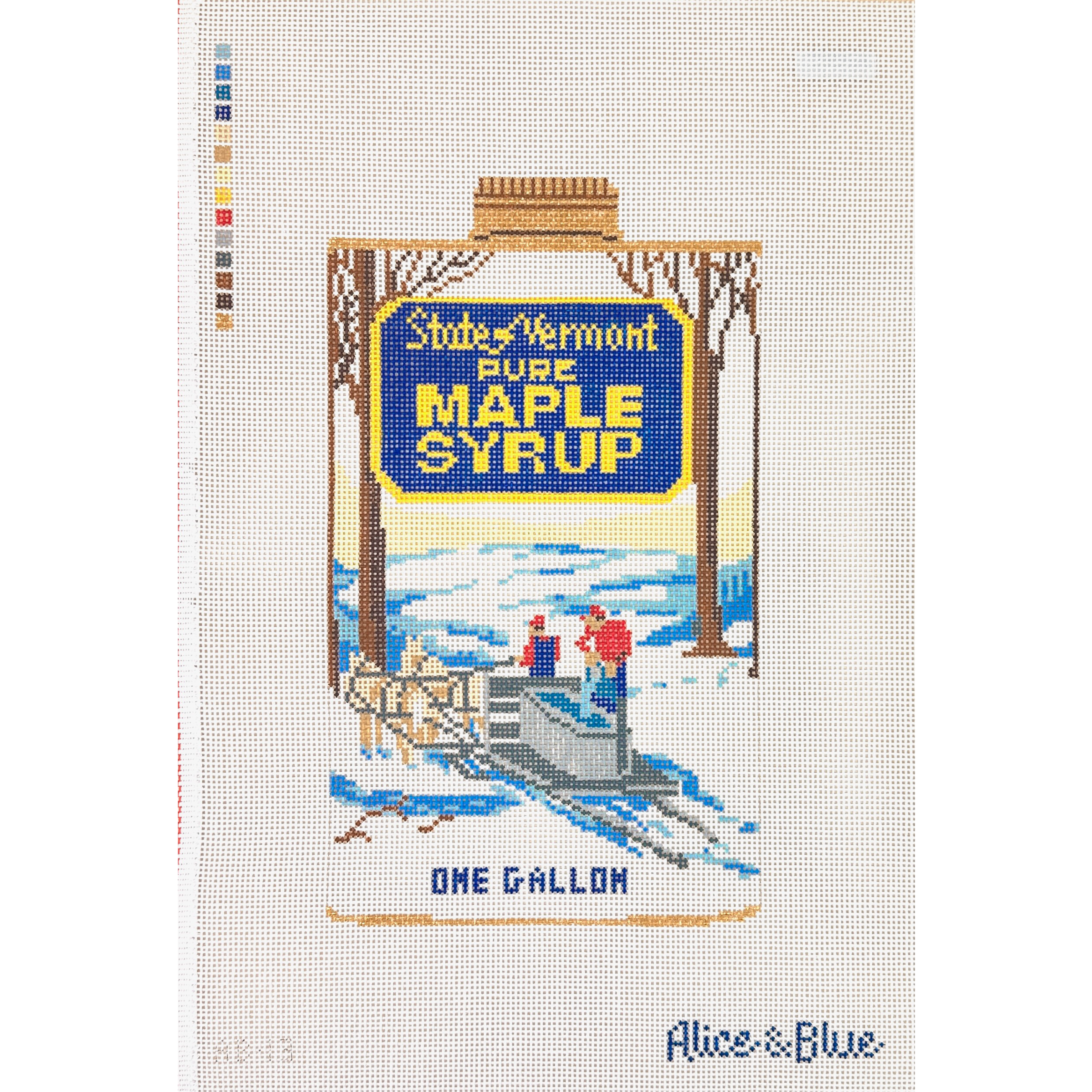 This hand painted needlepoint canvas from Alice & Blue features a large version of their popular Vermont maple syrup design.