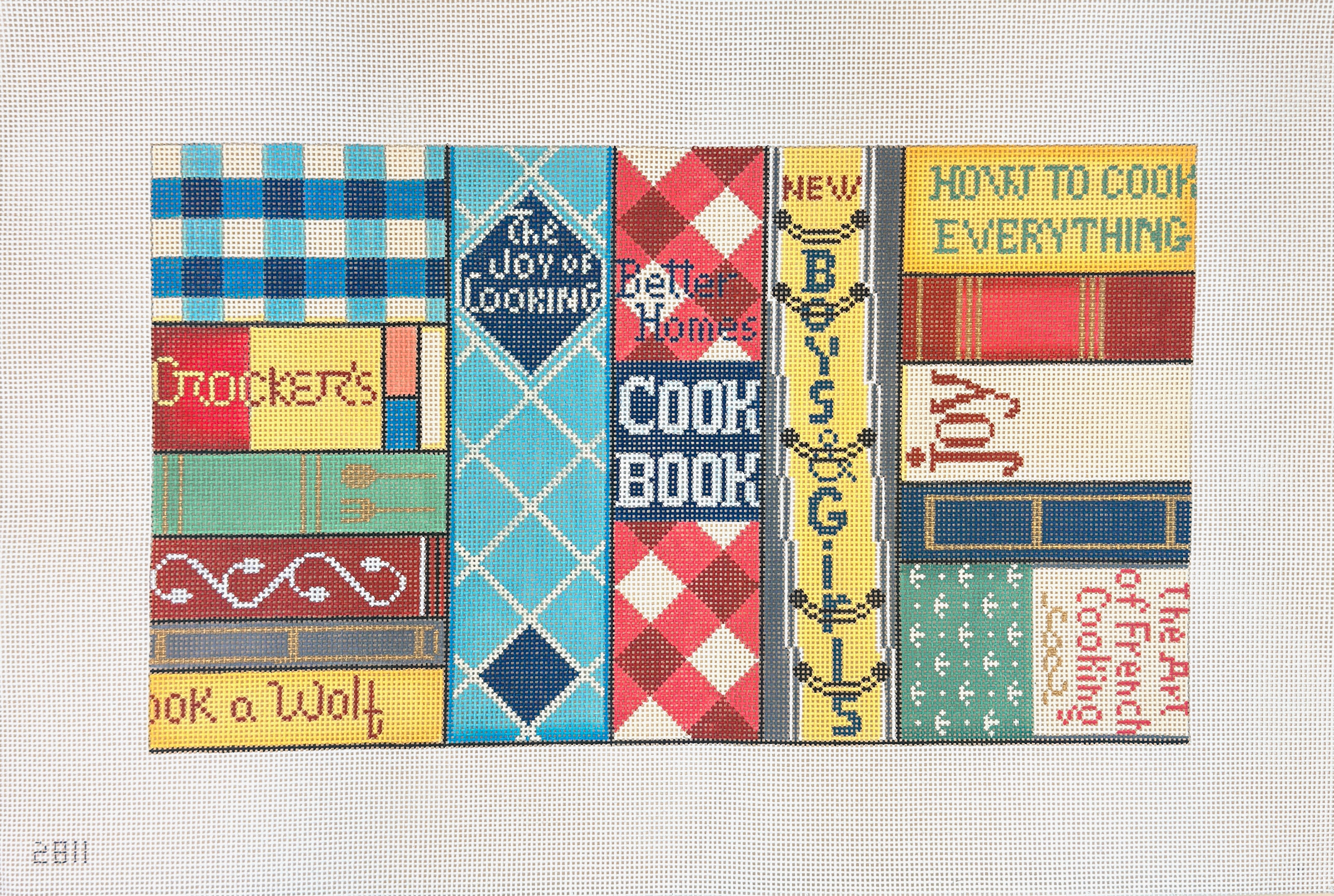 This hand painted needlepoint canvas from Alice Peterson Co. features a series of cookbooks stacked together.