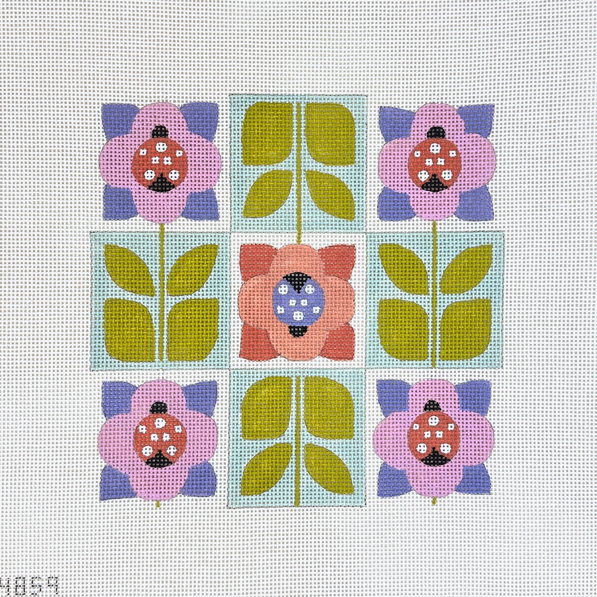 This is a hand painted needlepoint canvas by Alice Peterson Co. featuring a tic tac toe board with a flower and ladybug design.