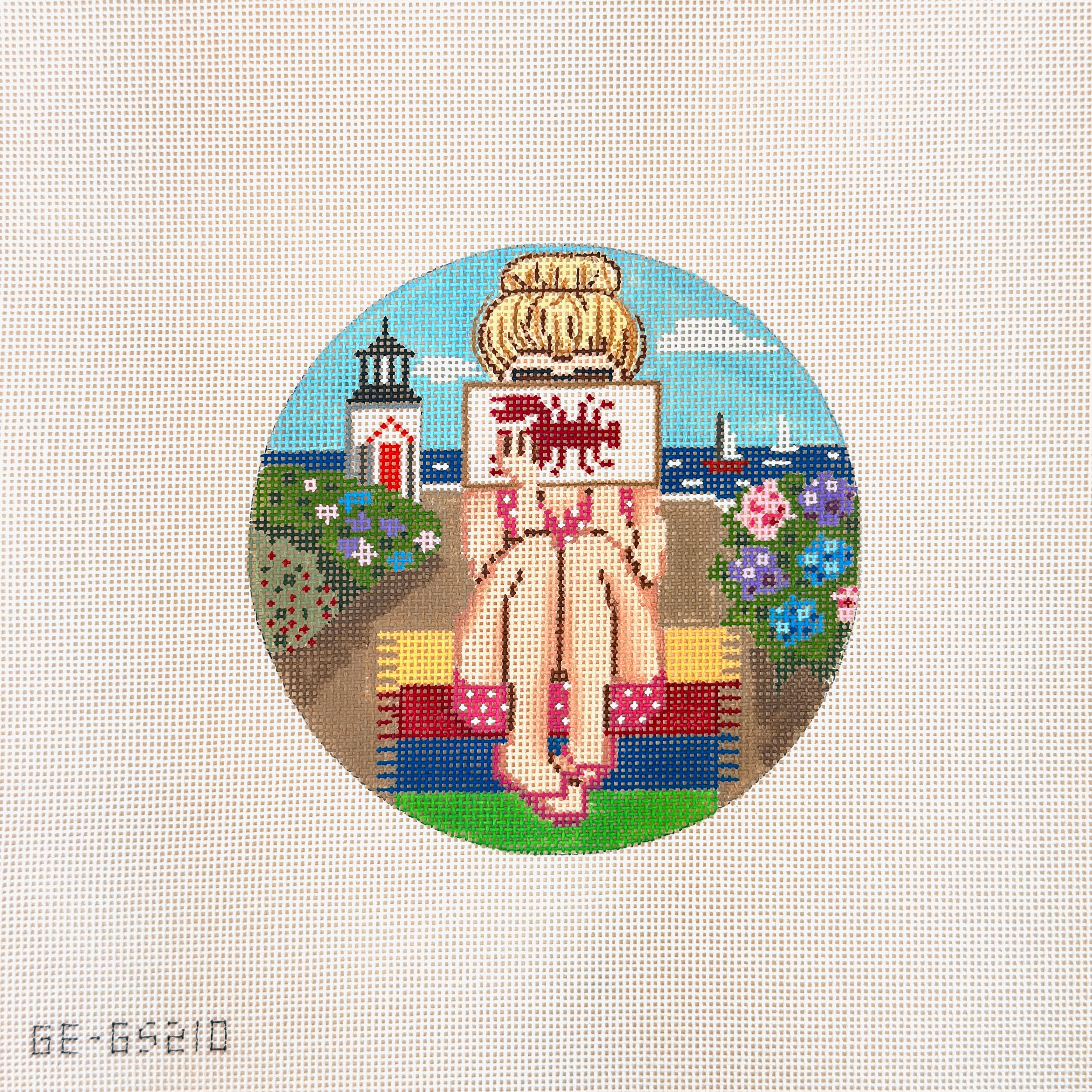 This hand painted needlepoint canvas by Gayla Elliott from Alice Peterson Co. features a girl stitching at the beach.