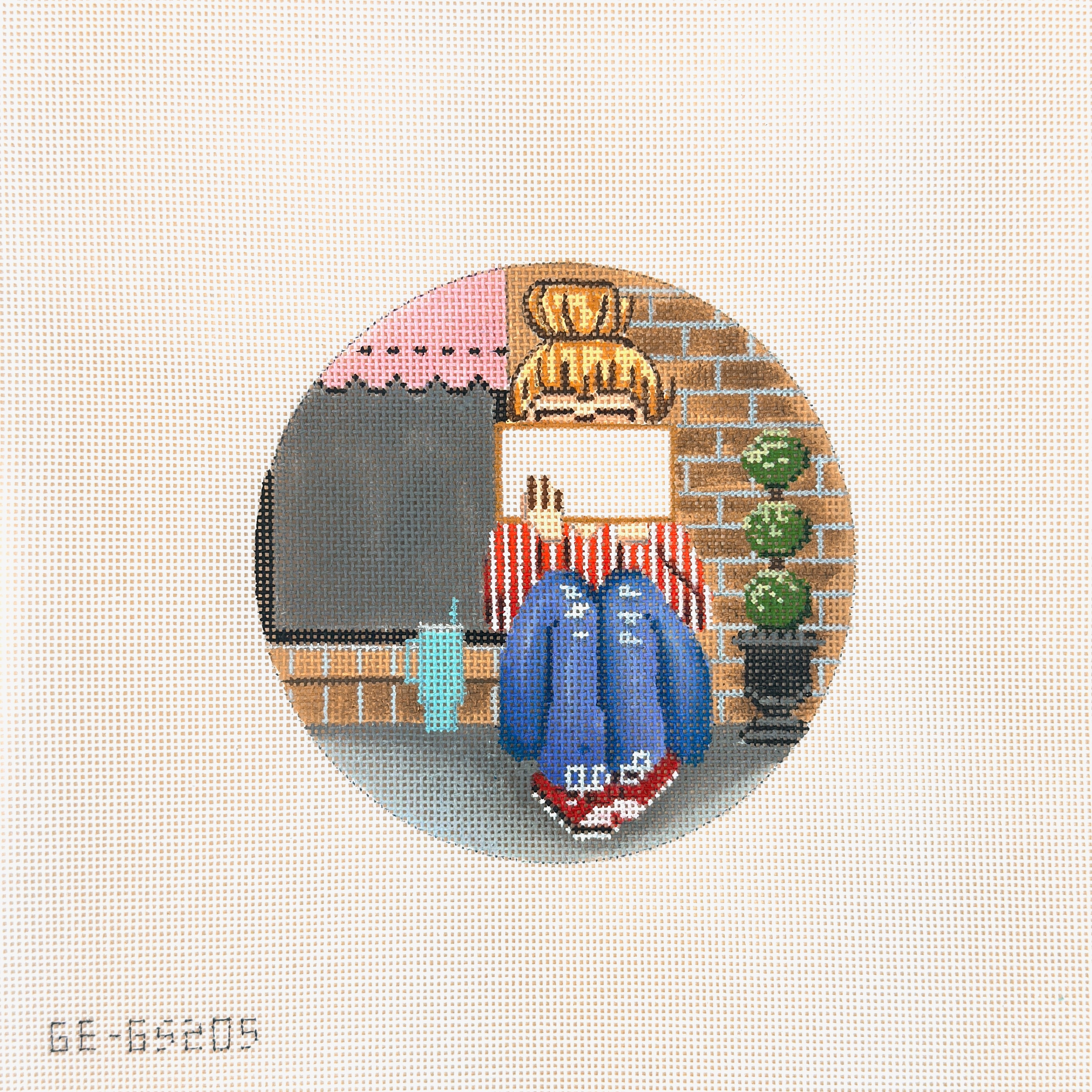 This hand painted needlepoint canvas by Gayla Elliott from Alice Peterson Co. features a girl stitching on a city street.