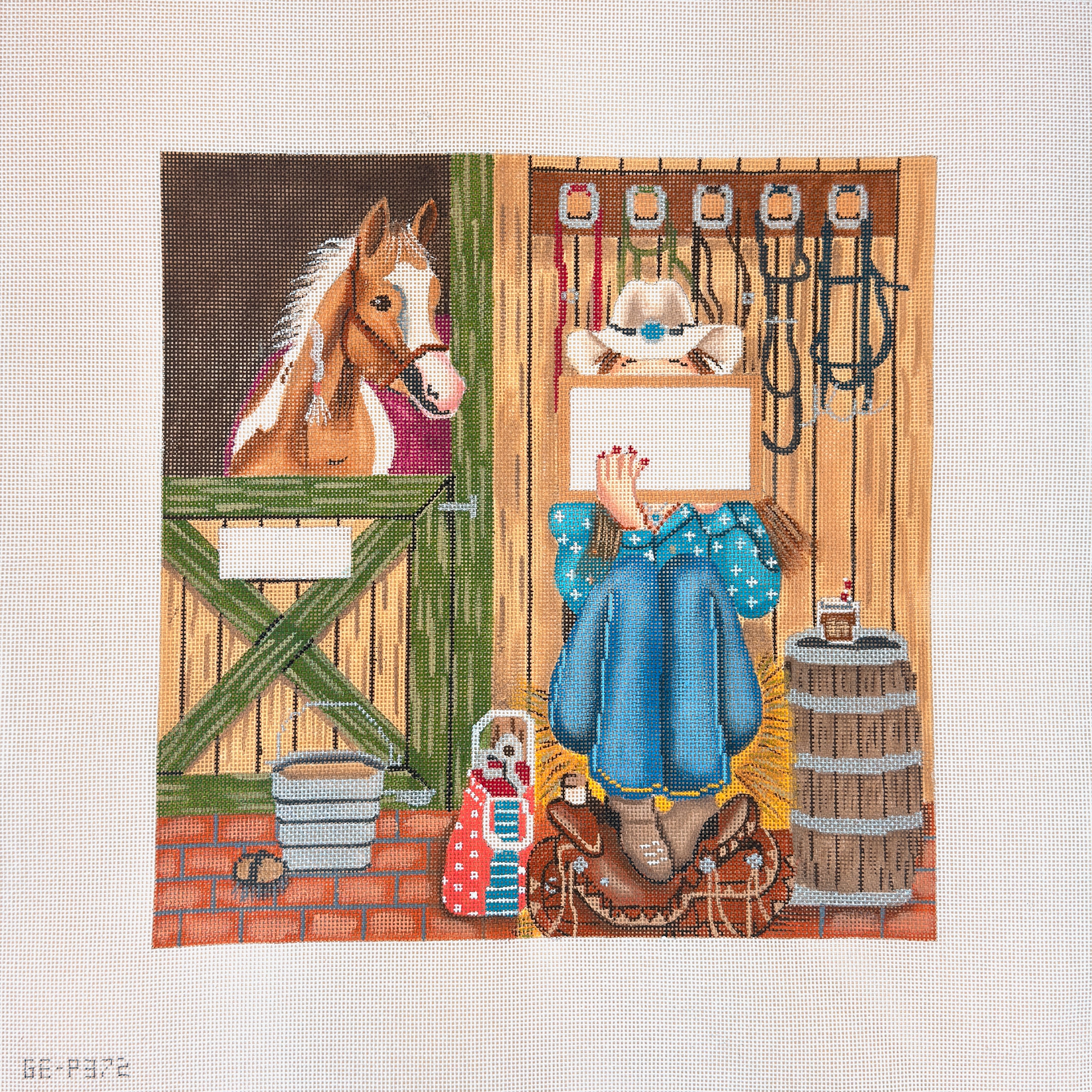 This hand painted needlepoint canvas by Gayla Elliott from Alice Peterson Co. features a girl stitching in a horse barn.