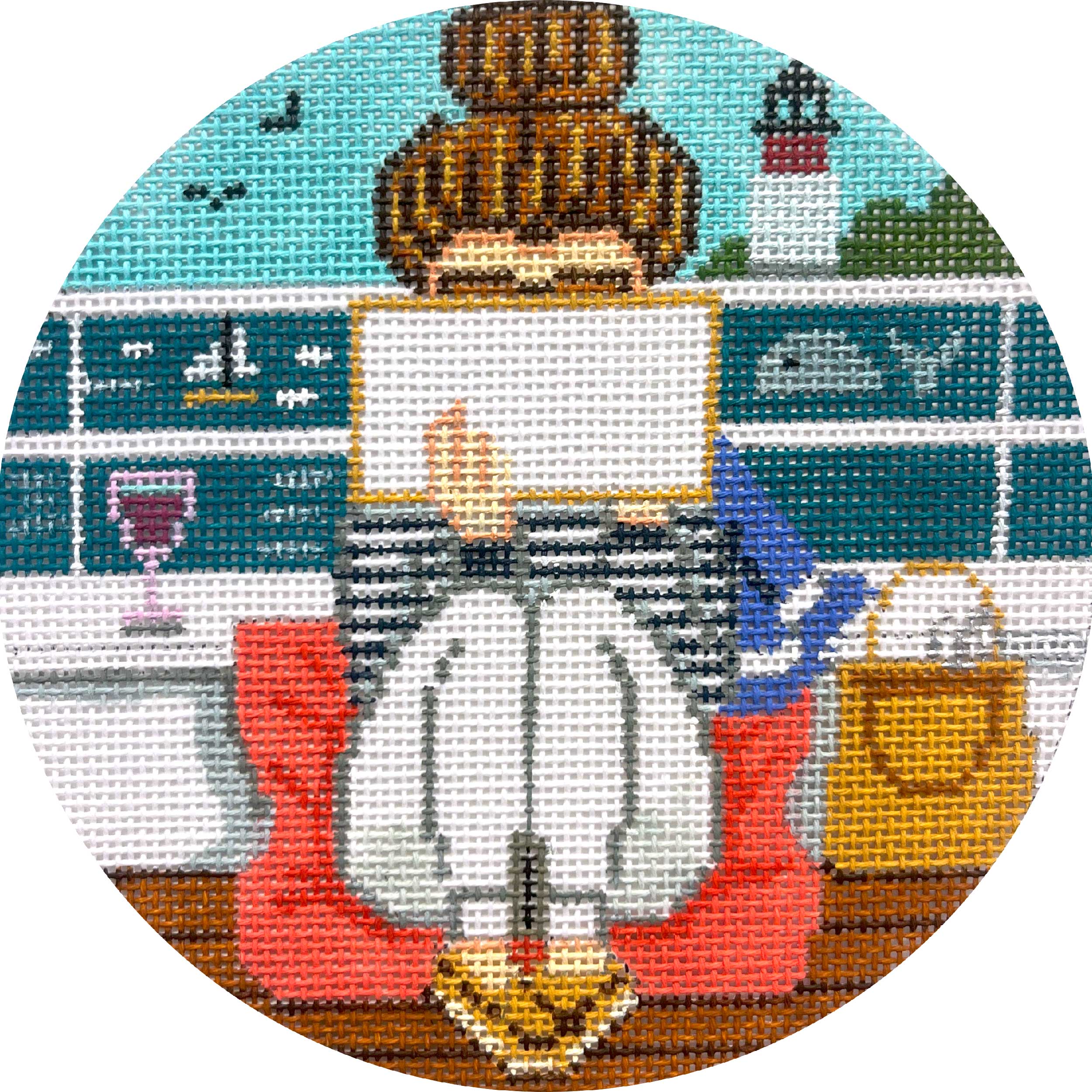 This is a hand painted needlepoint canvas by Gayla Elliot for Alice Peterson Co. It features a girl stitching a needlework project and sitting on a coral cushion on the deck of a sailboat, with an ocean scene in the background.