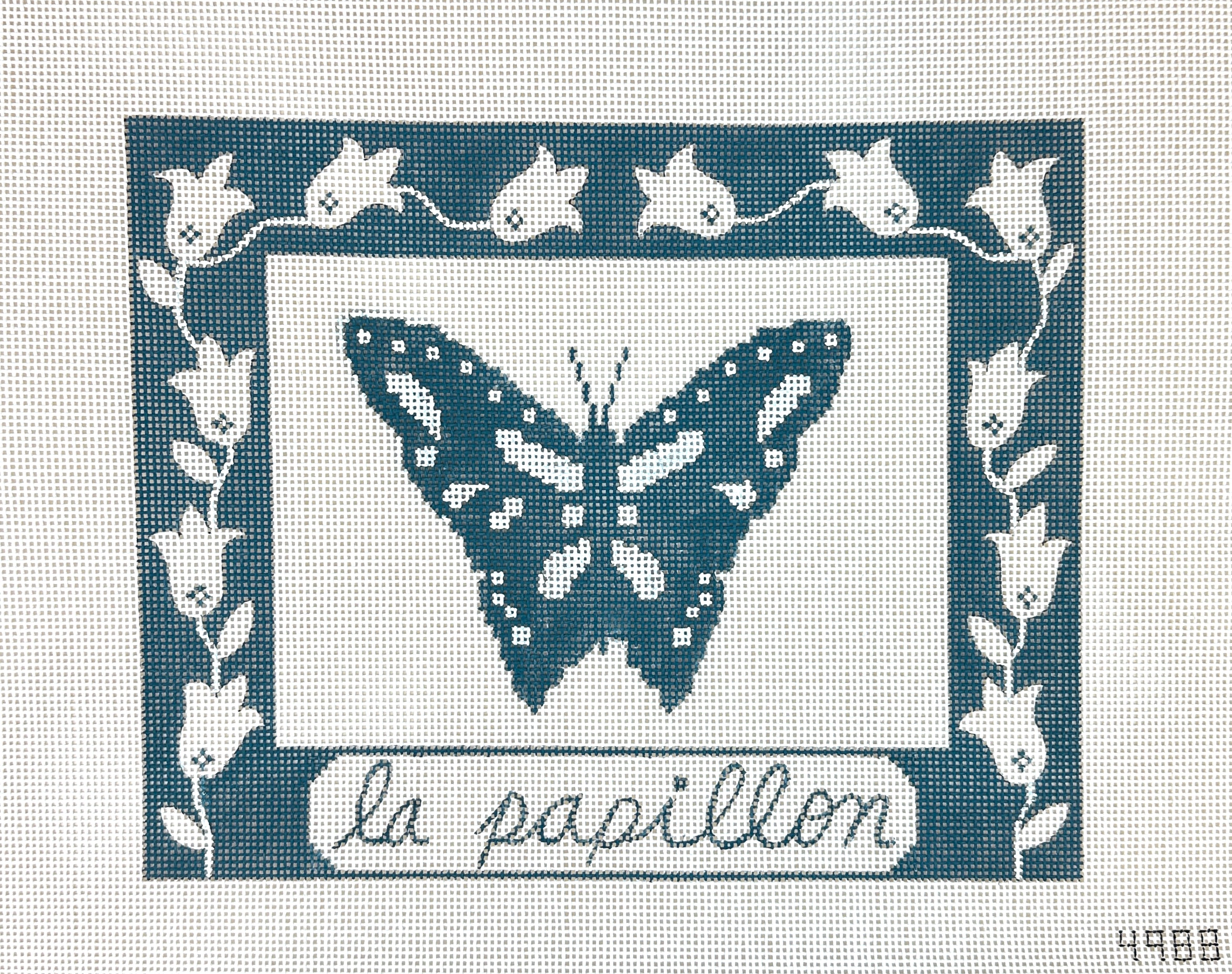 This is a hand painted needlepoint canvas by Alice Peterson Co. featuring a butterfly in classic blue and white.