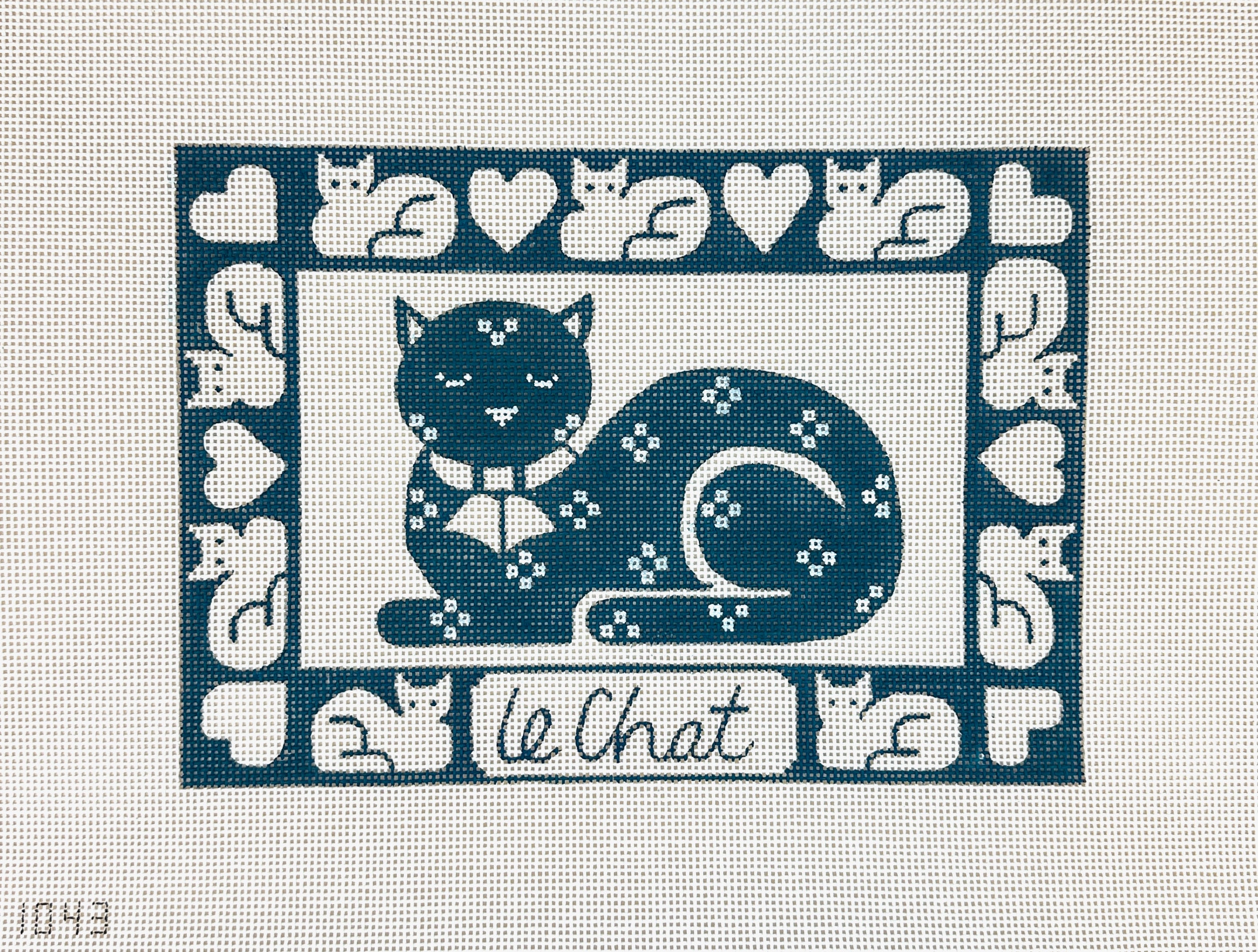 A beautiful hand painted needlepoint design from Alice Peterson Co. featuring a blue and white provencal design with a cat.