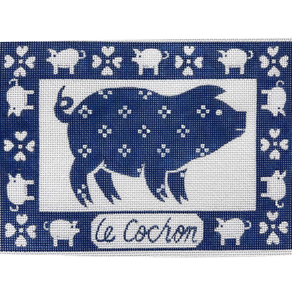 A beautiful hand painted needlepoint design from Alice Peterson Co. featuring a blue and white provencal design with a pig.