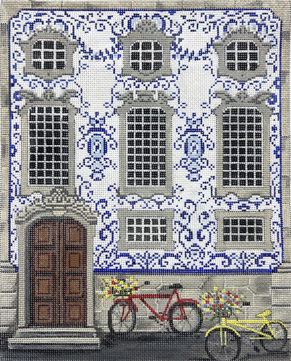 This hand painted needlepoint canvas by Alice Peterson Co. features a street scene in Portugal with a beautiful tiled facade.