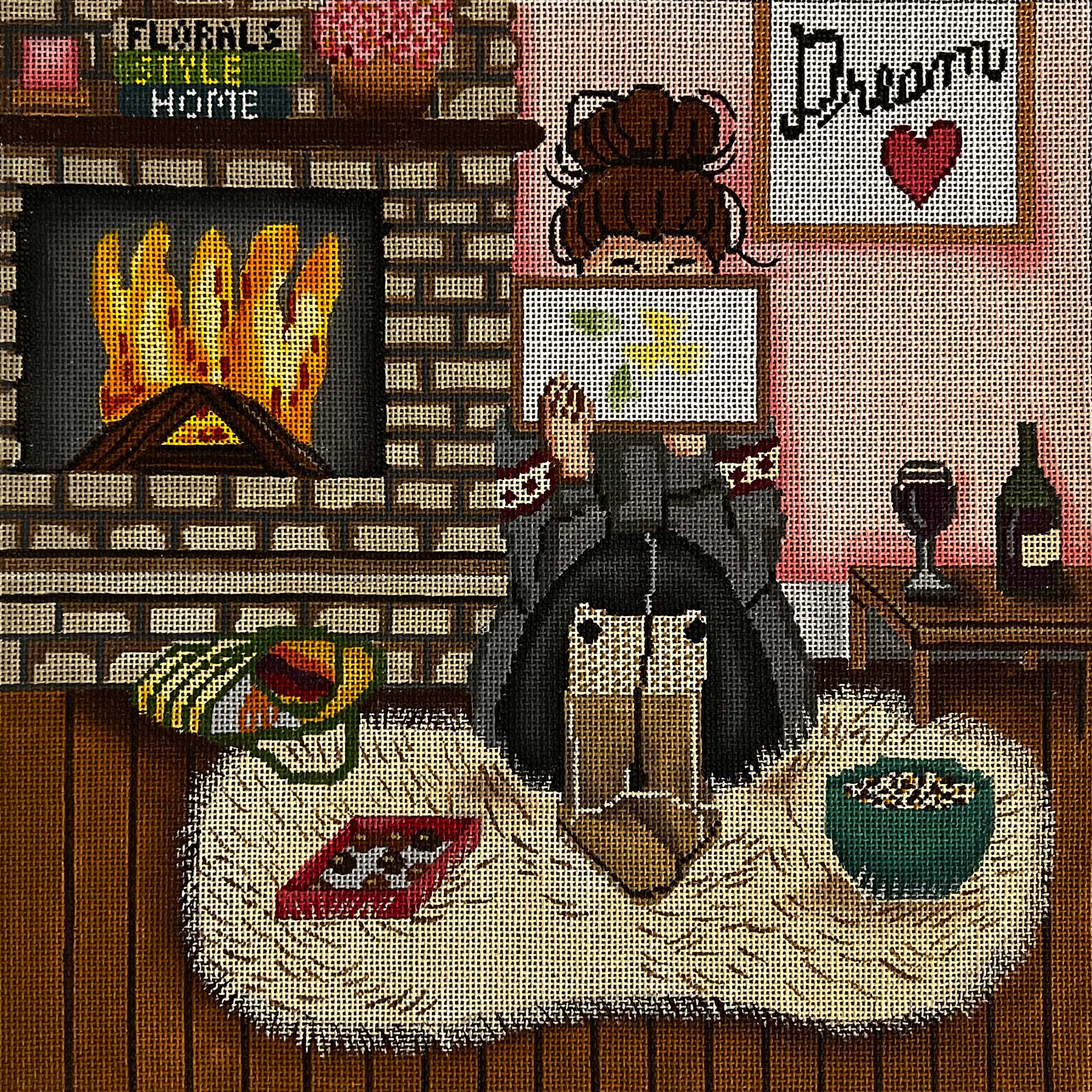 This hand painted needlepoint canvas by Alice Peterson Co. features a girl intently stitching in front of a fireplace.