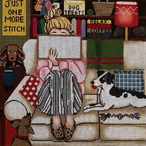 This hand painted needlepoint canvas by Gayla Elliot for Alice Peterson Co. features a stitcher in a cozy home scene with a few dog friends.