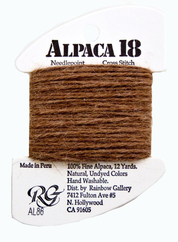 This is Alpaca from Rainbow Gallery in color 086 Tan. Made with real Alpaca! Perfect for fur and beards. 2 ply on 13 mesh, 1 ply on 18 mesh.