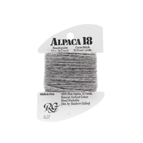 This is Alpaca from Rainbow Gallery in color 087 Heather Gray. Made with real Alpaca! Perfect for fur and beards. 2 ply on 13 mesh, 1 ply on 18 mesh.