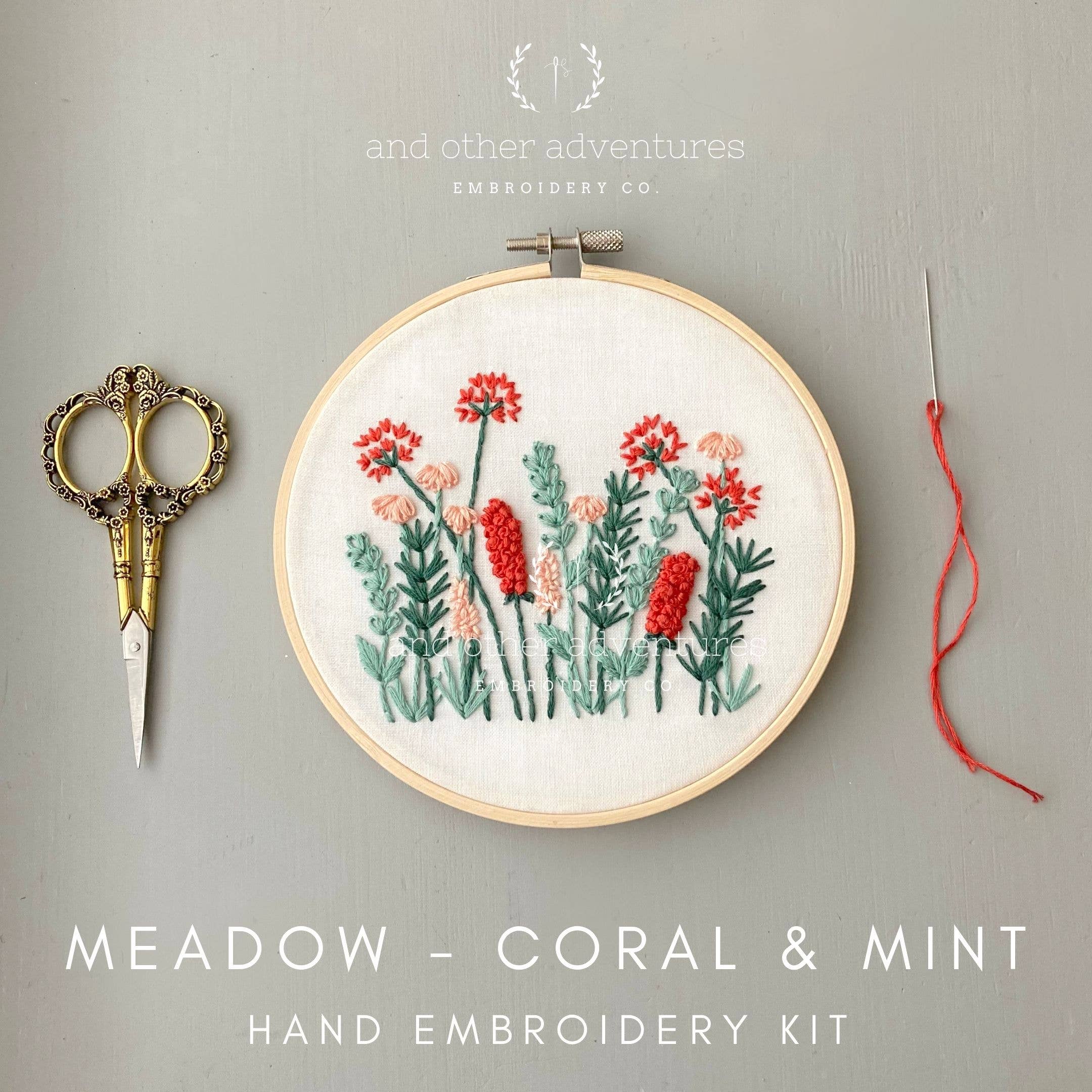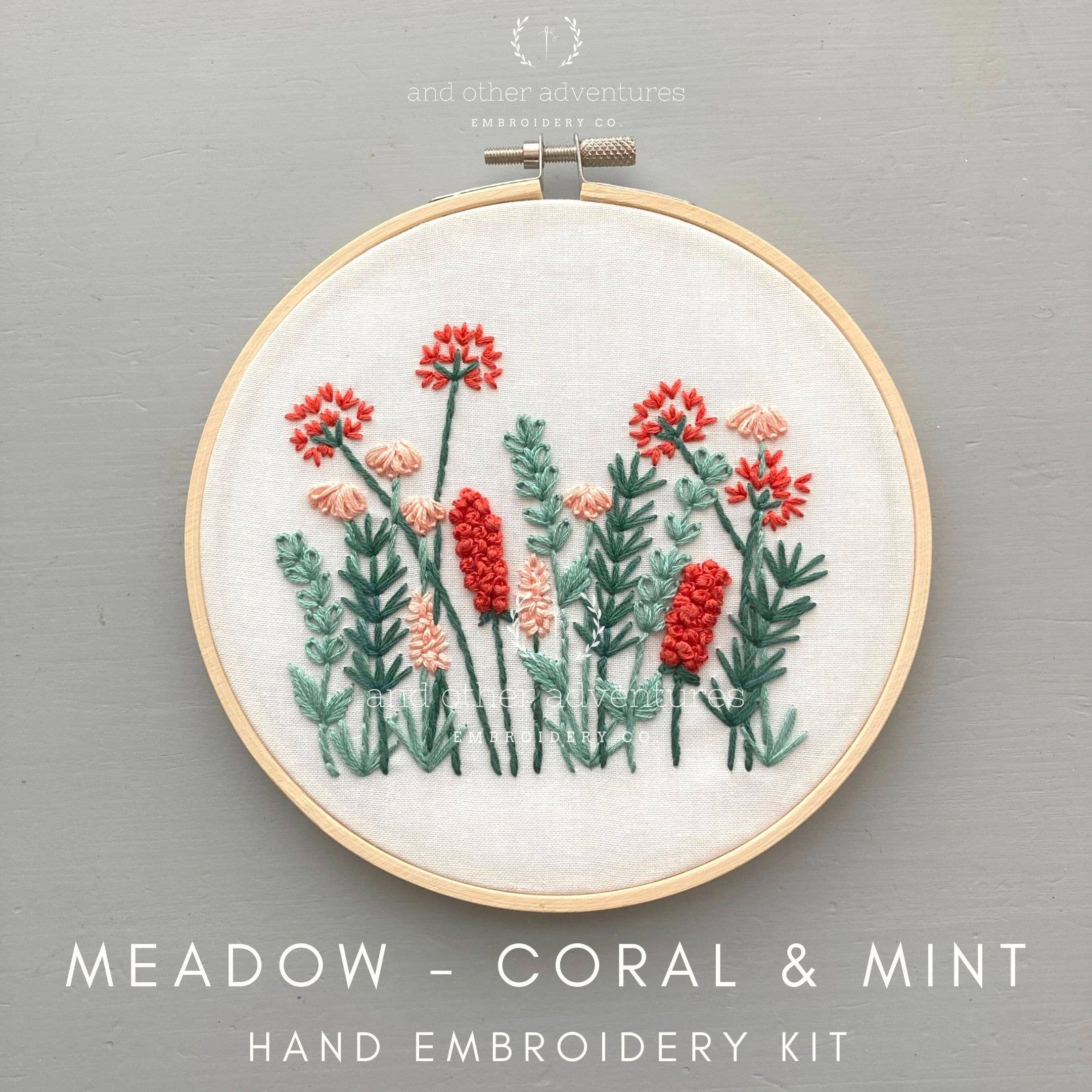 This is an embroidery kit from And Other Adventures Embroidery Co. It features a pretty wildflowers in reds and light coral. This is a great beginner embroidery kit that will teach you several foundational embroidery stitches.