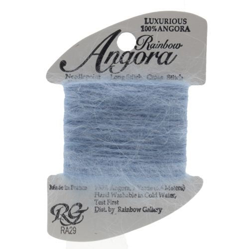 This is Angora from Rainbow Gallery in color 29 Blue Booties. Made with real Angora! Perfect for fur and beards. 2 or 3 ply on 13 mesh, 1 or 2 ply on 18 mesh.