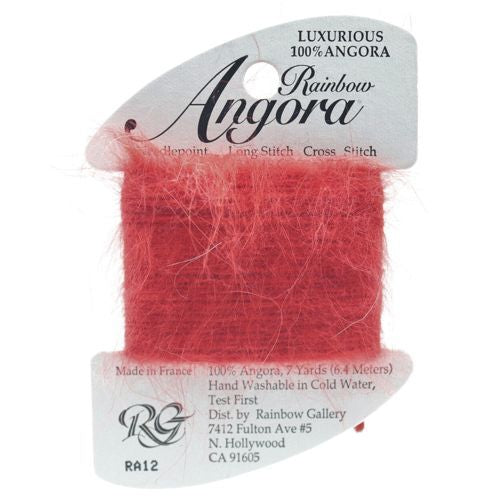 This is Angora from Rainbow Gallery in color 12 Christmas Red. Made with real Angora! Perfect for fur and beards. 2 or 3 ply on 13 mesh, 1 or 2 ply on 18 mesh.