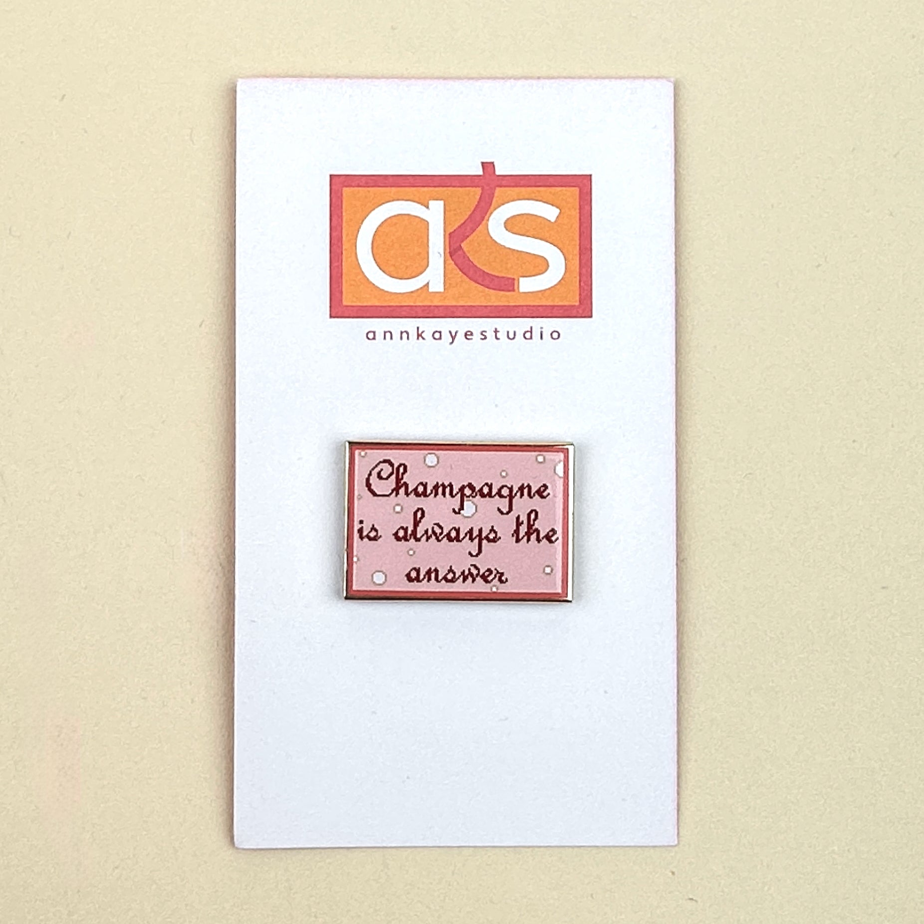This is a metal and enamel needle minder from Ann Kaye Studio. It features a the phrase "Champagne is Always the Answer" in shades of pink.
