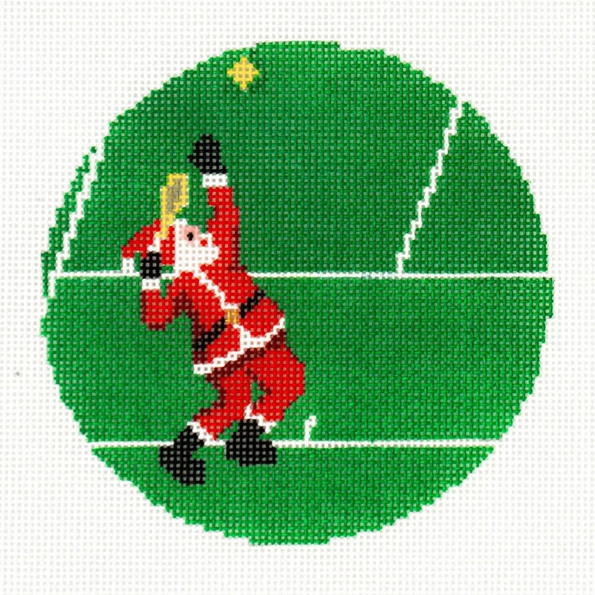 This hand painted needlepoint canvas from Ann Kaye Studio features a sporty Santa Claus playing tennis.