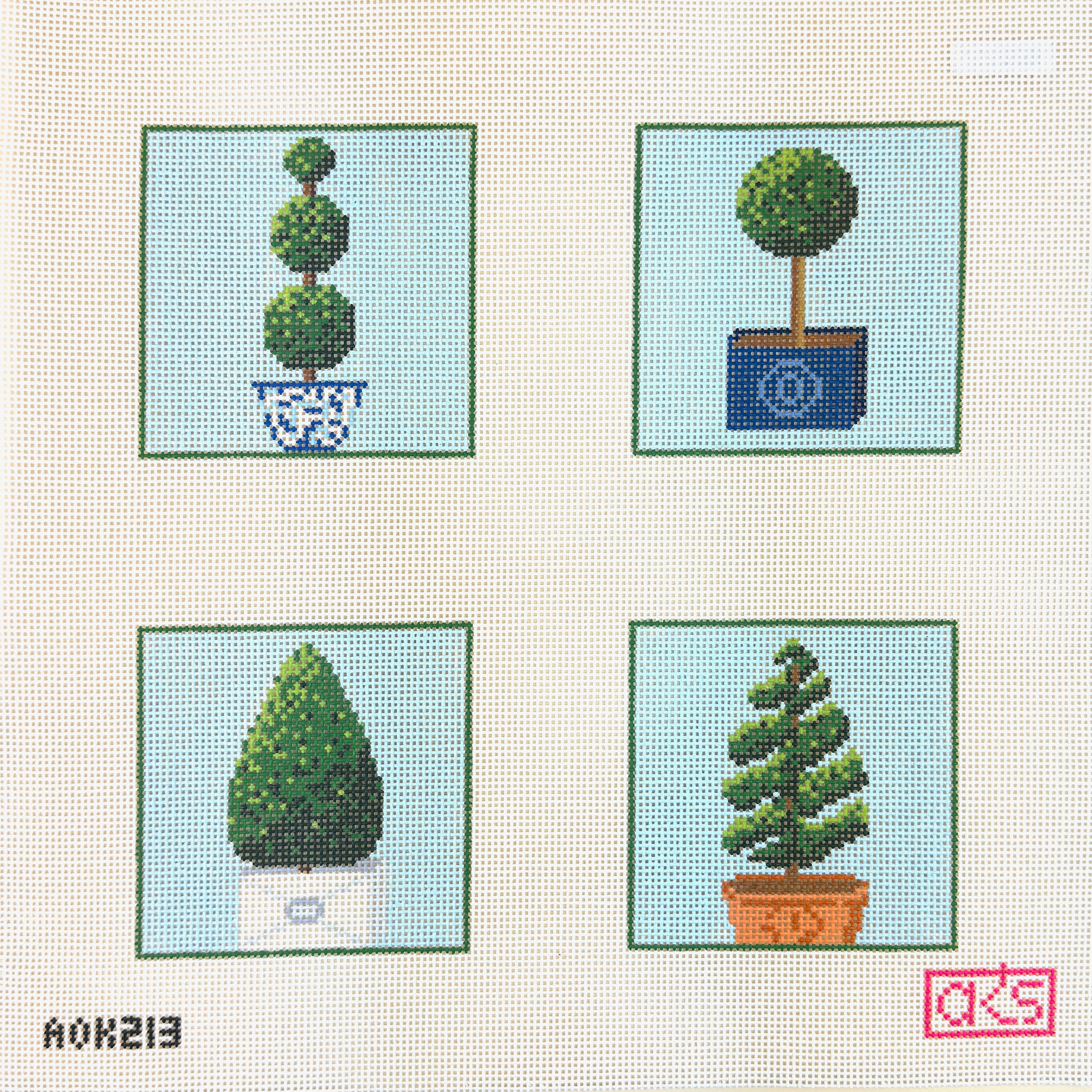 This hand painted needlepoint canvas from Ann Kaye Studio features a series of coasters with different topiary plants on them.