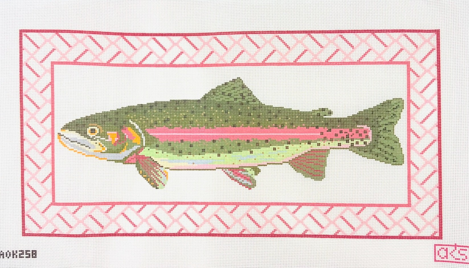 This hand painted needlepoint canvas from Ann Kaye Studio features a pillow with a trout on it.