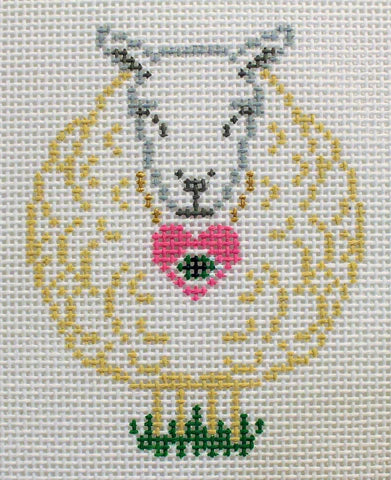 This clever hand painted needlepoint canvas by Anne Fisher has a hidden message. With a plump ewe wearing a heart with an eye in the center, it acts as a pictograph or rebus puzzle meaning "I love you".