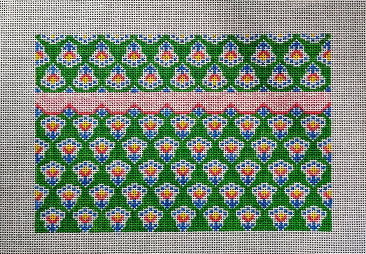 This is a hand painted needlepoint canvas by Anne Fisher Designs. It features a clutch made up of a cute provincial pattern.