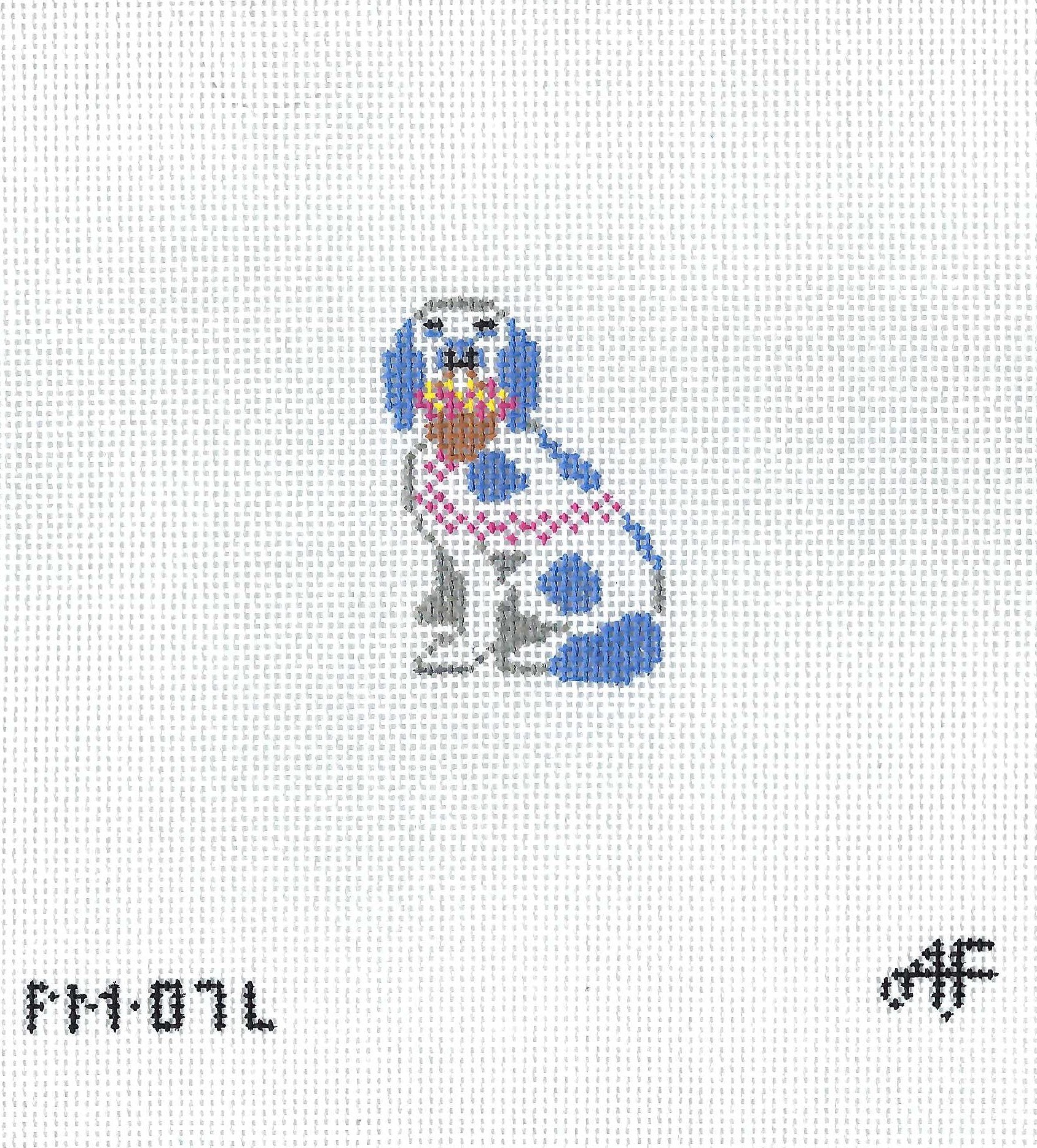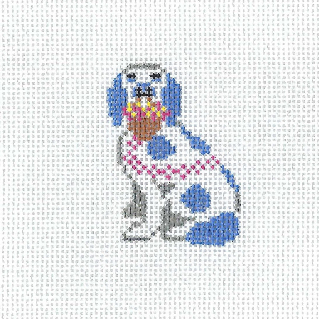 This mini needlepoint canvas by Anne Fisher features a classic blue and white Staffordshire dog holding a basket of flowers. This one is left facing. Pick up the right facing as well if you'd like a perfect pair.
