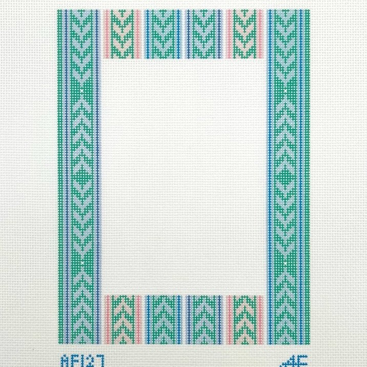 A beautiful hand painted picture frame needlepoint canvas from Anne Fisher Designs featuring a trellis design in fresh shades of green, blue and pink. This frame fits a 5" x 7" picture.