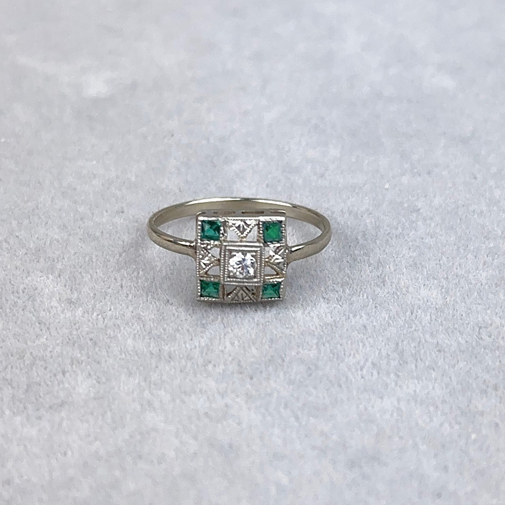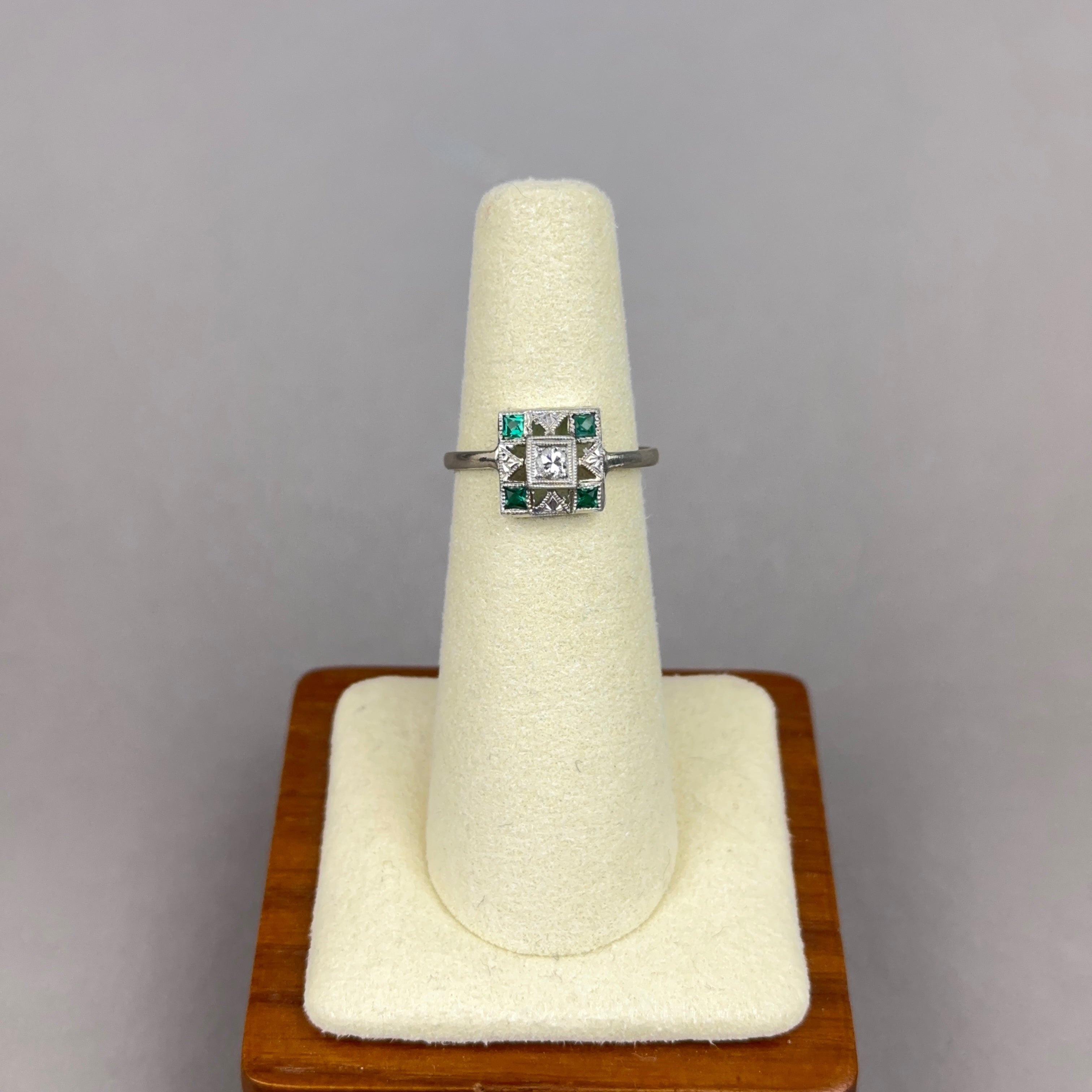 This is an antique Art Deco ring from the 1920s. It features a hand carved and pierced 14k white gold design with a milgrain set old mine cut diamond with French cut lab created emeralds.