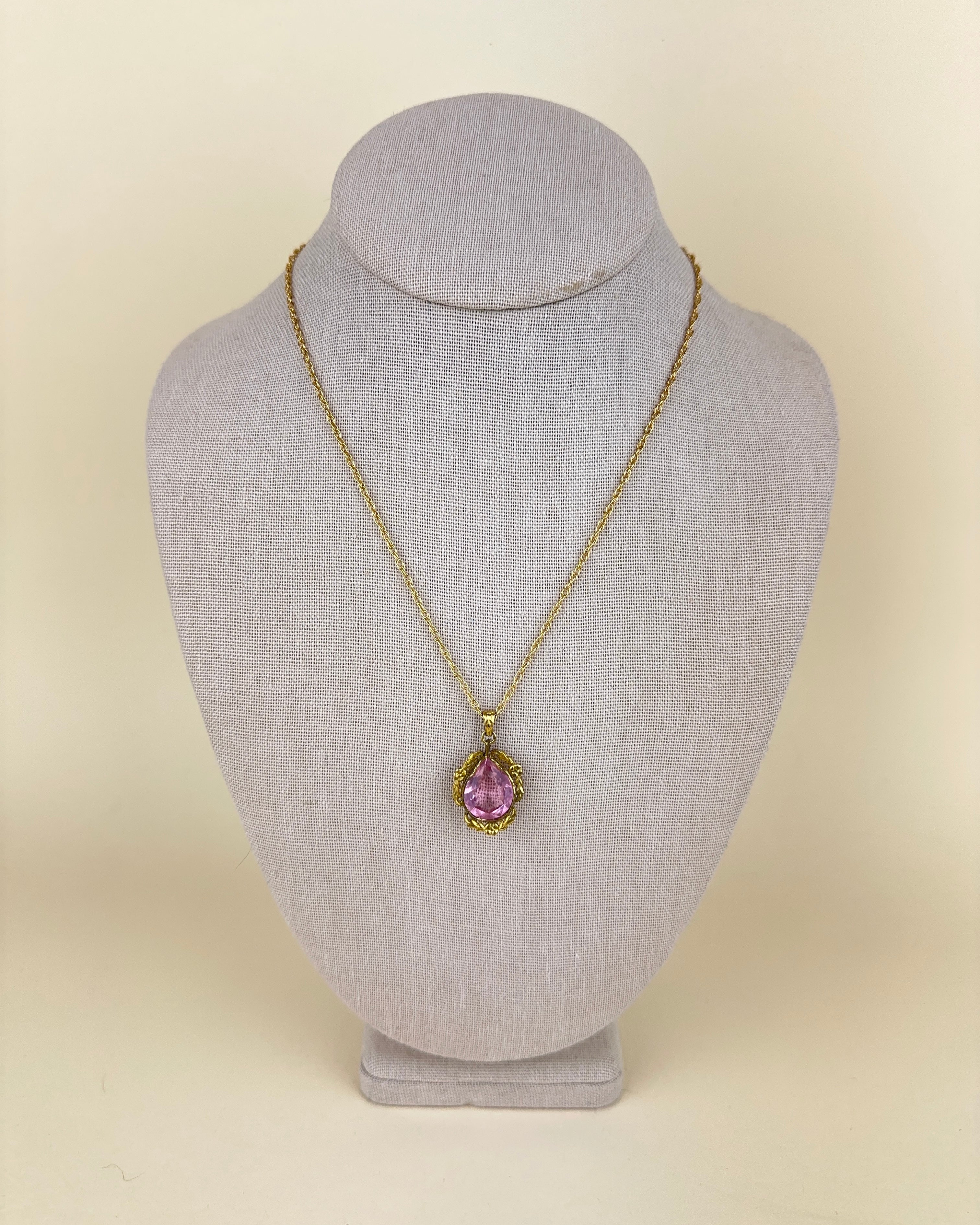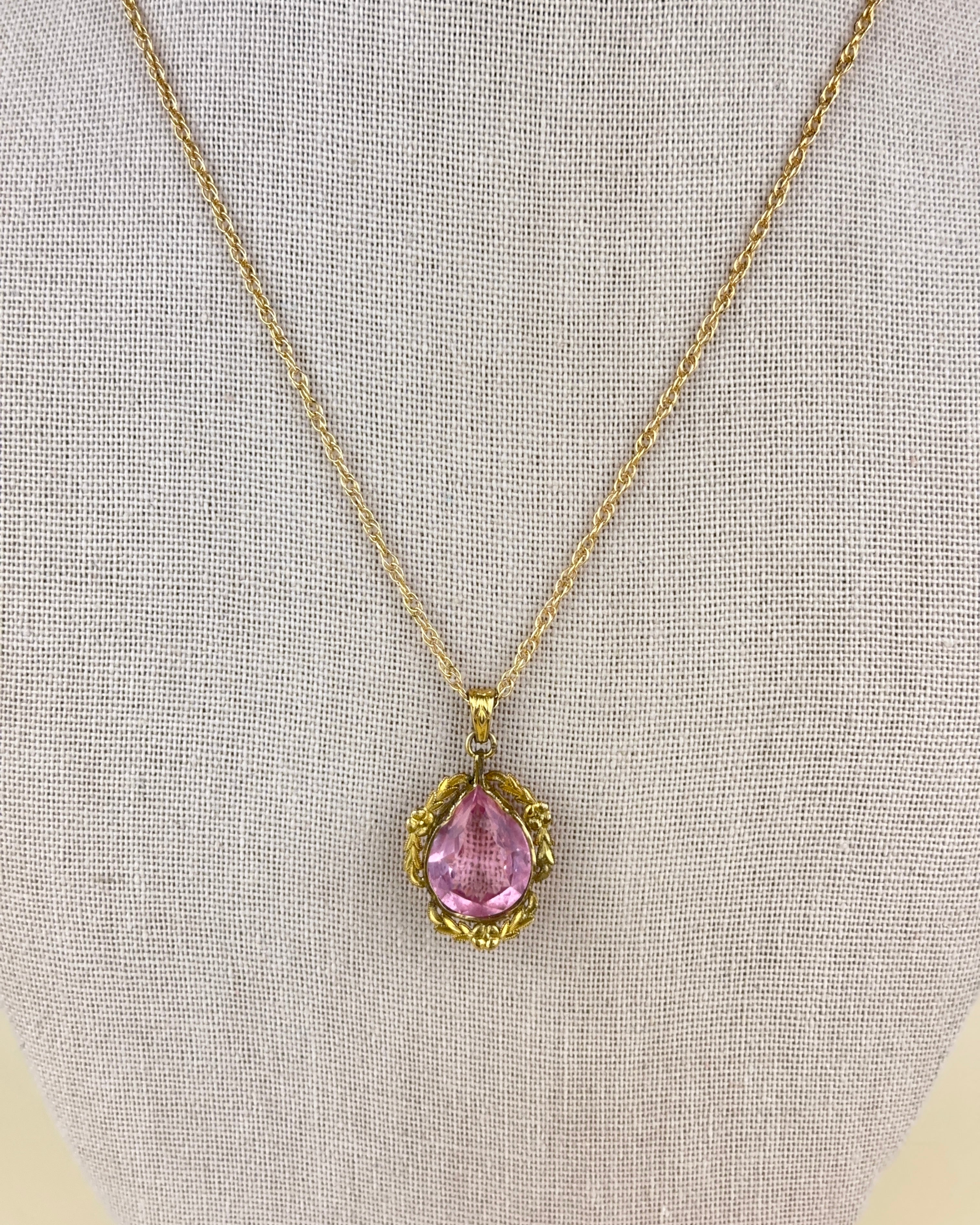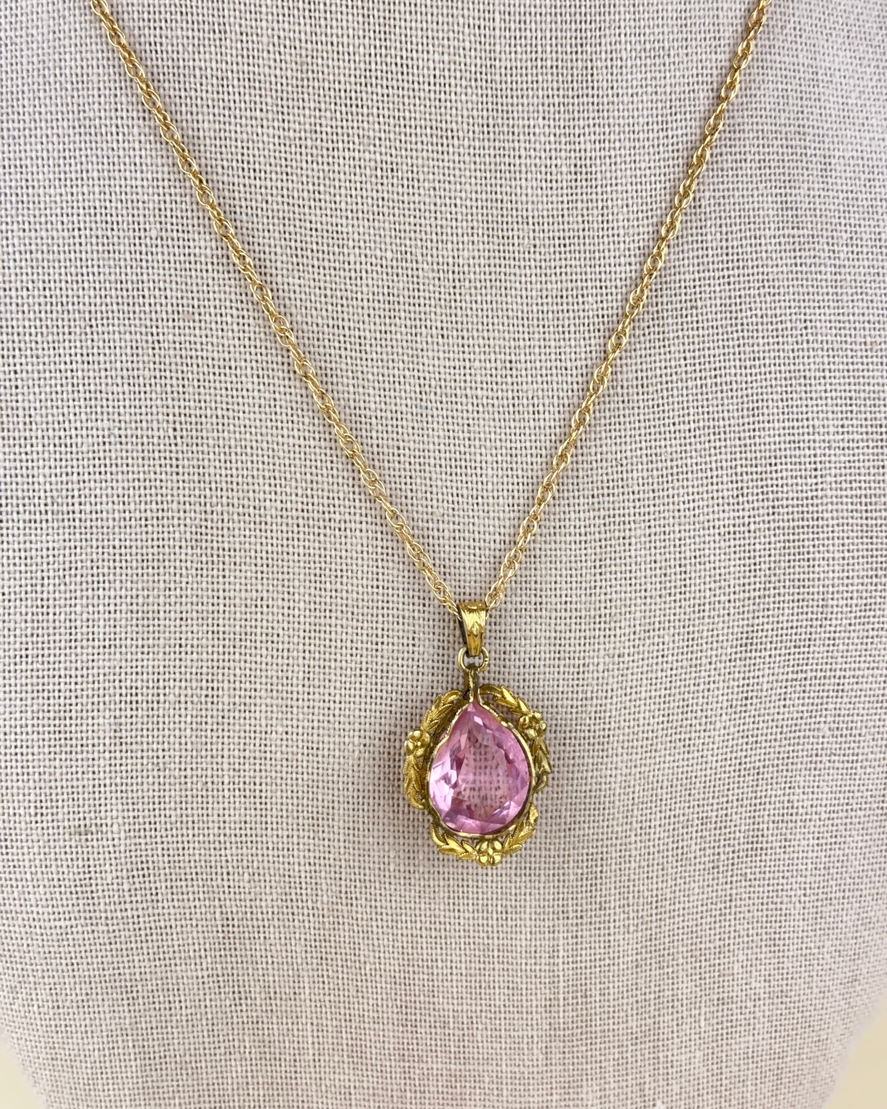 From the early 1900s, this Edwardian pendant features pretty gold filled floral metalwork around a beautiful pink paste stone. It is on a modern 14k gold filled chain.