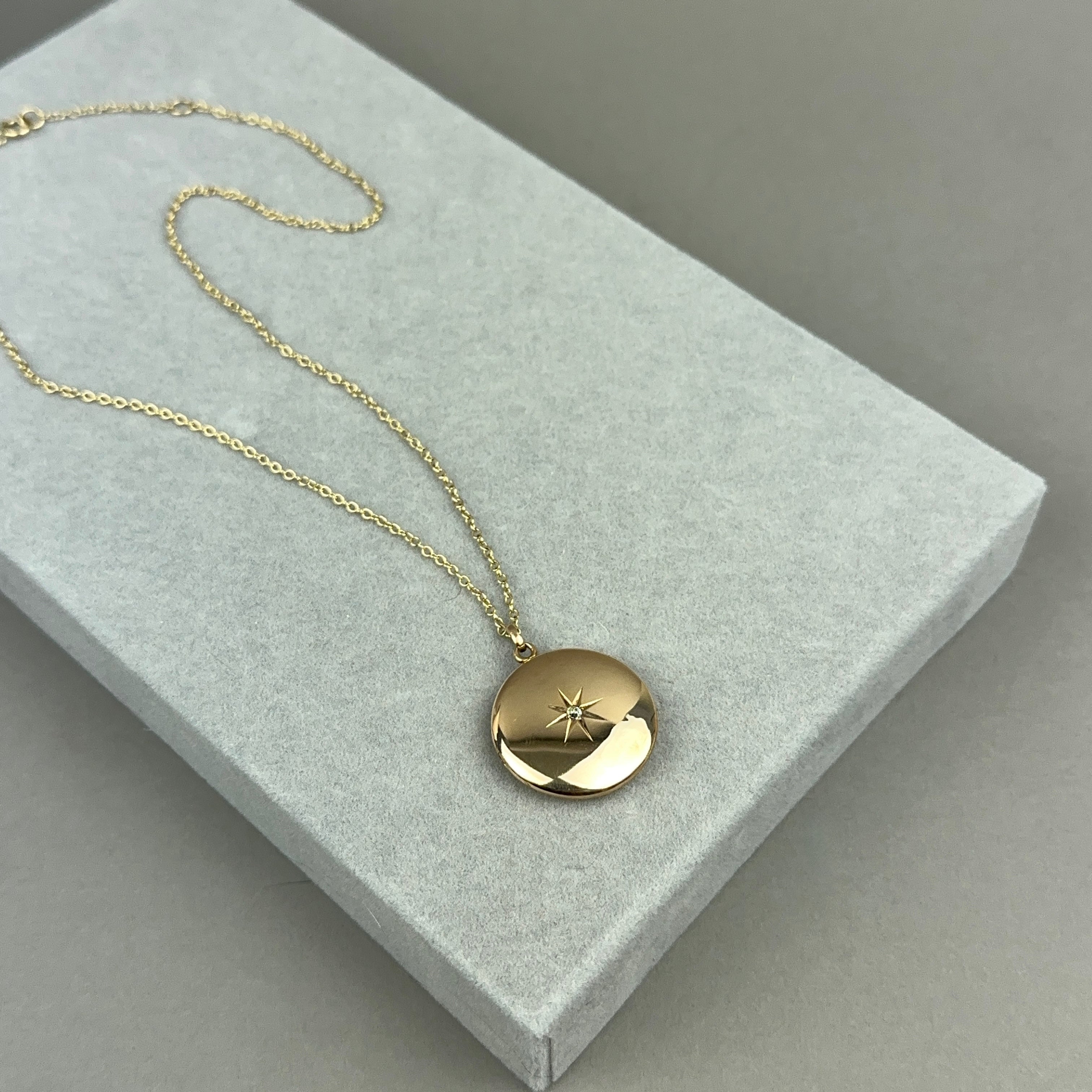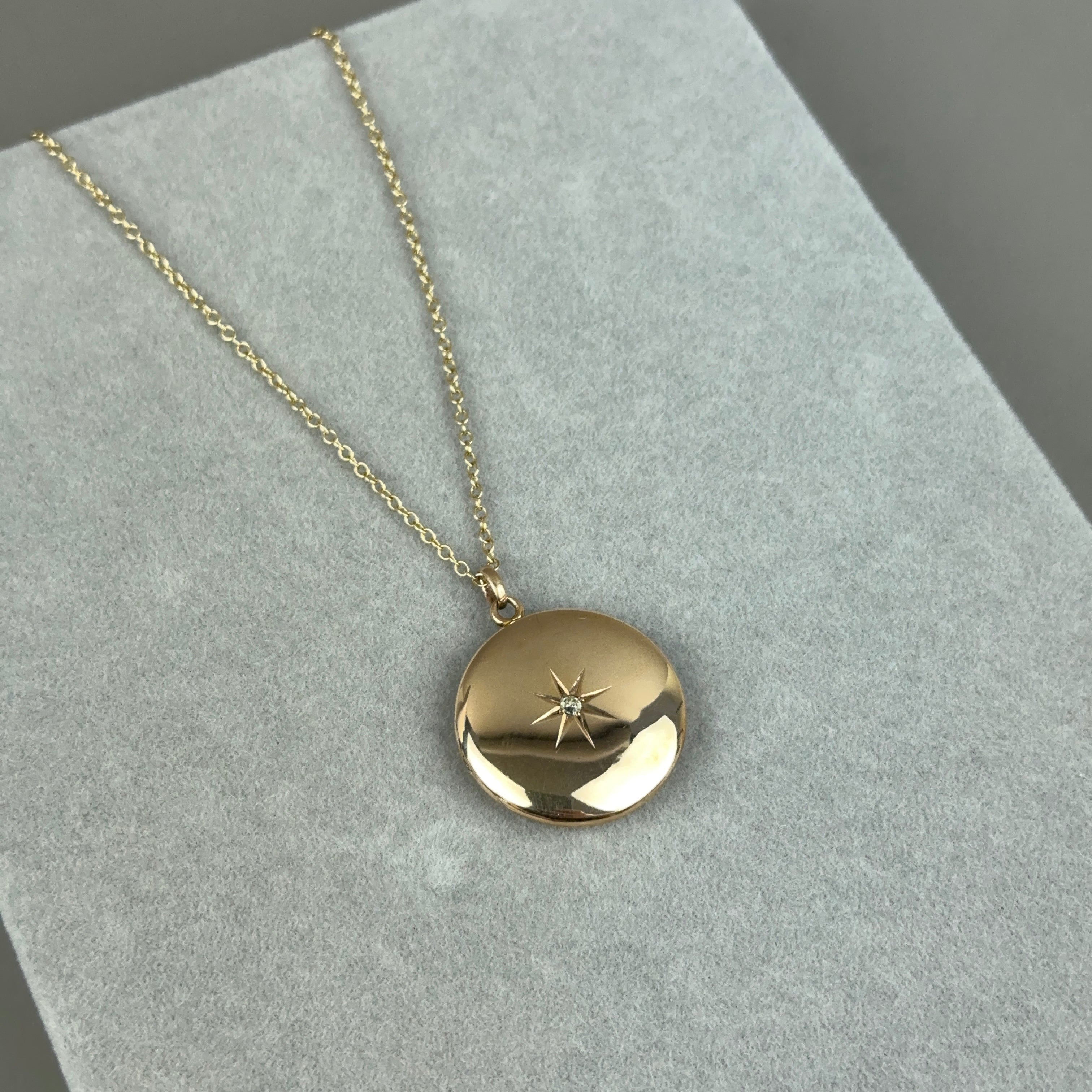 This antique American made locket necklace from the 1900s features sleek 10k gold with a star set old mine cut diamond.
