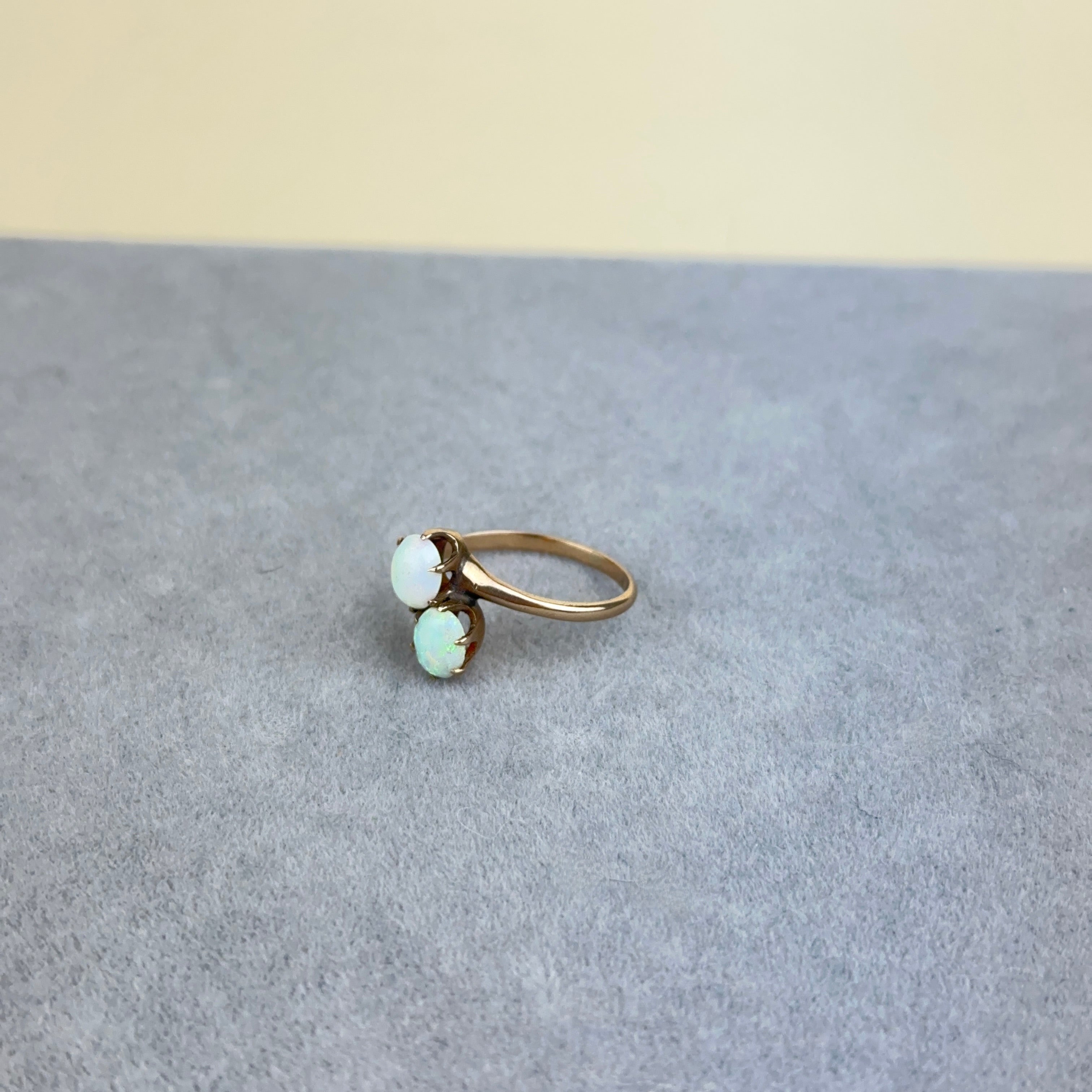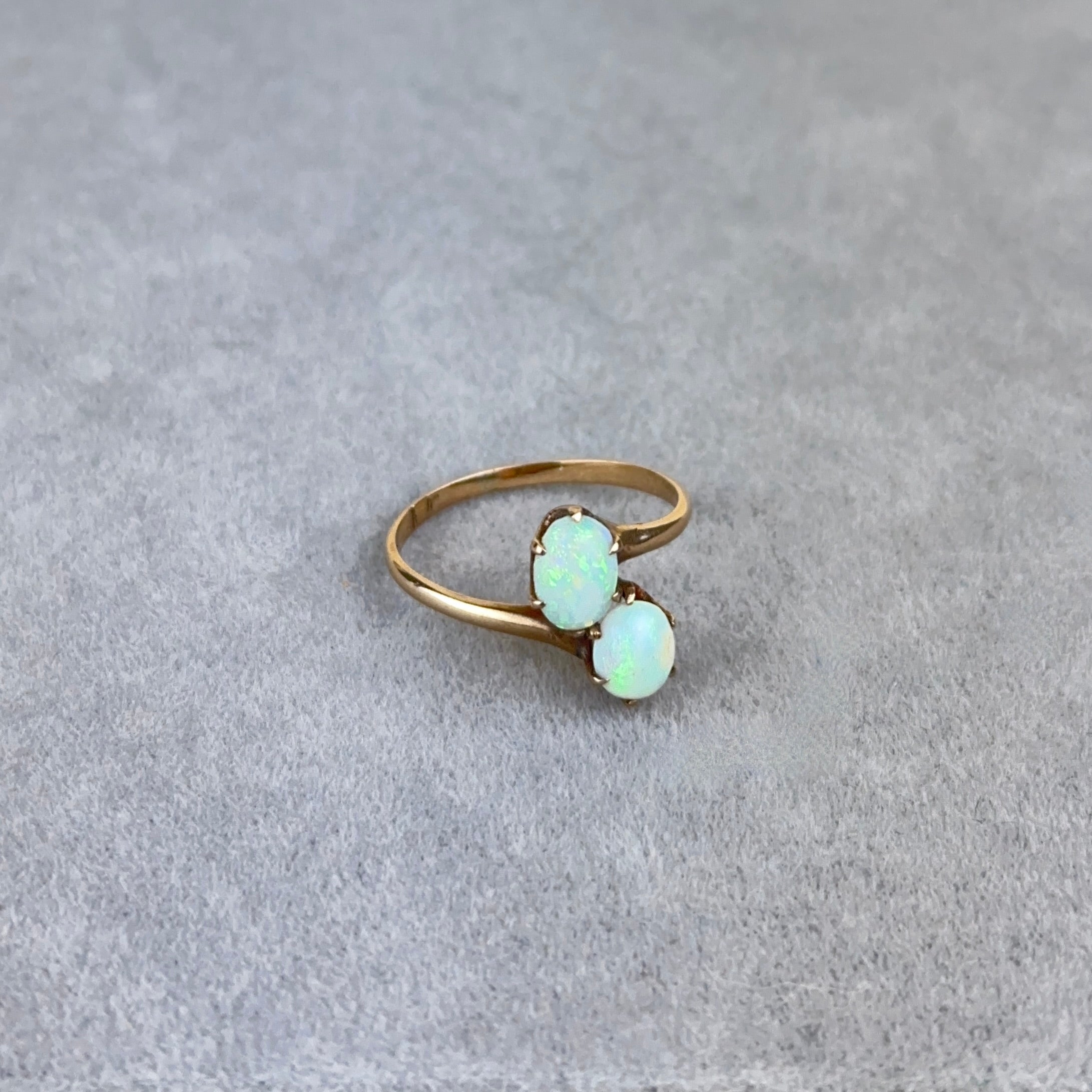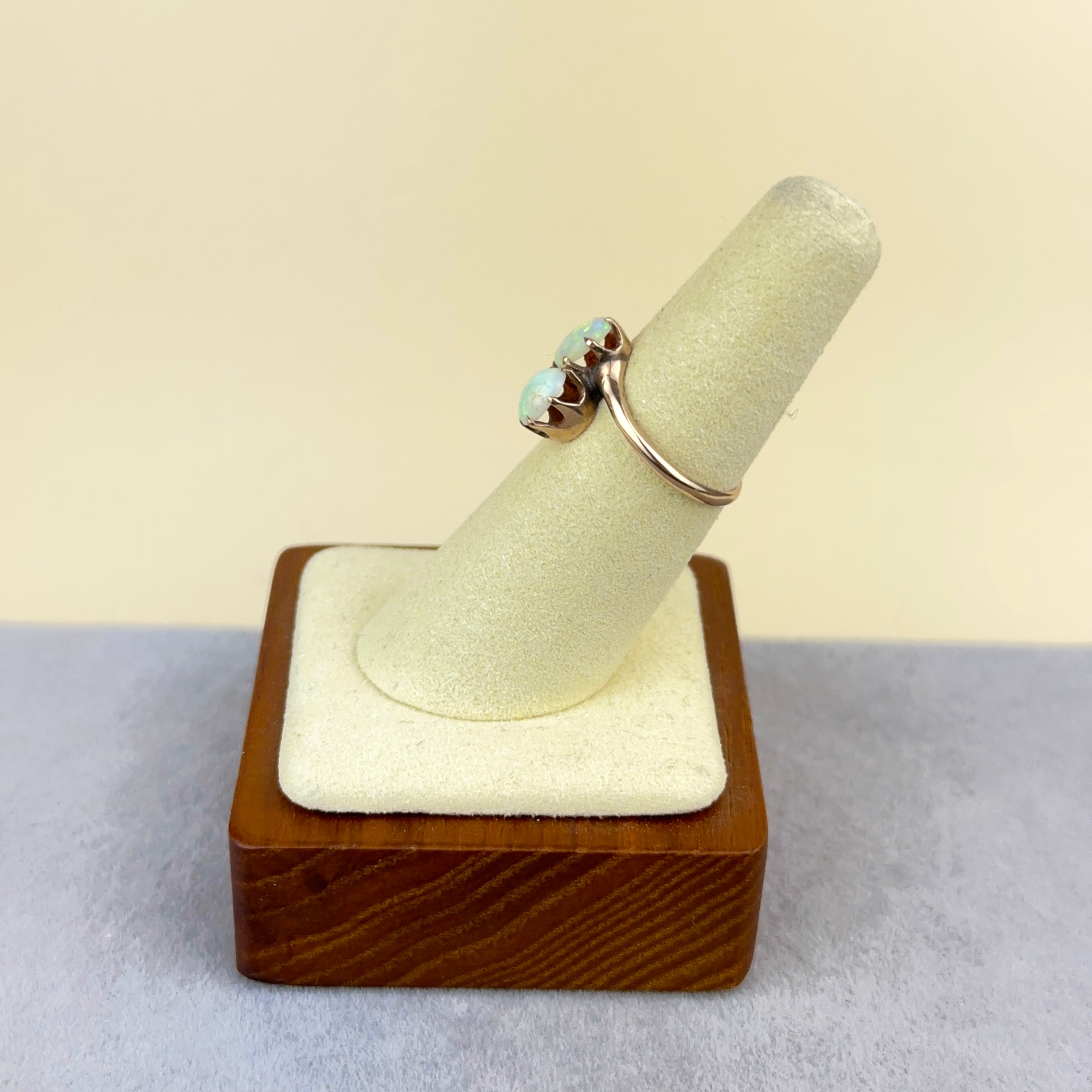 This is an antique Victorian bypass ring from the 1890s. It features two lovely oval opals prong set in 10k gold.