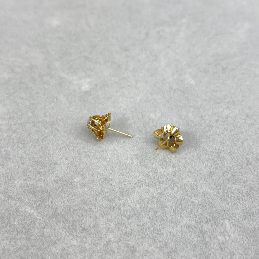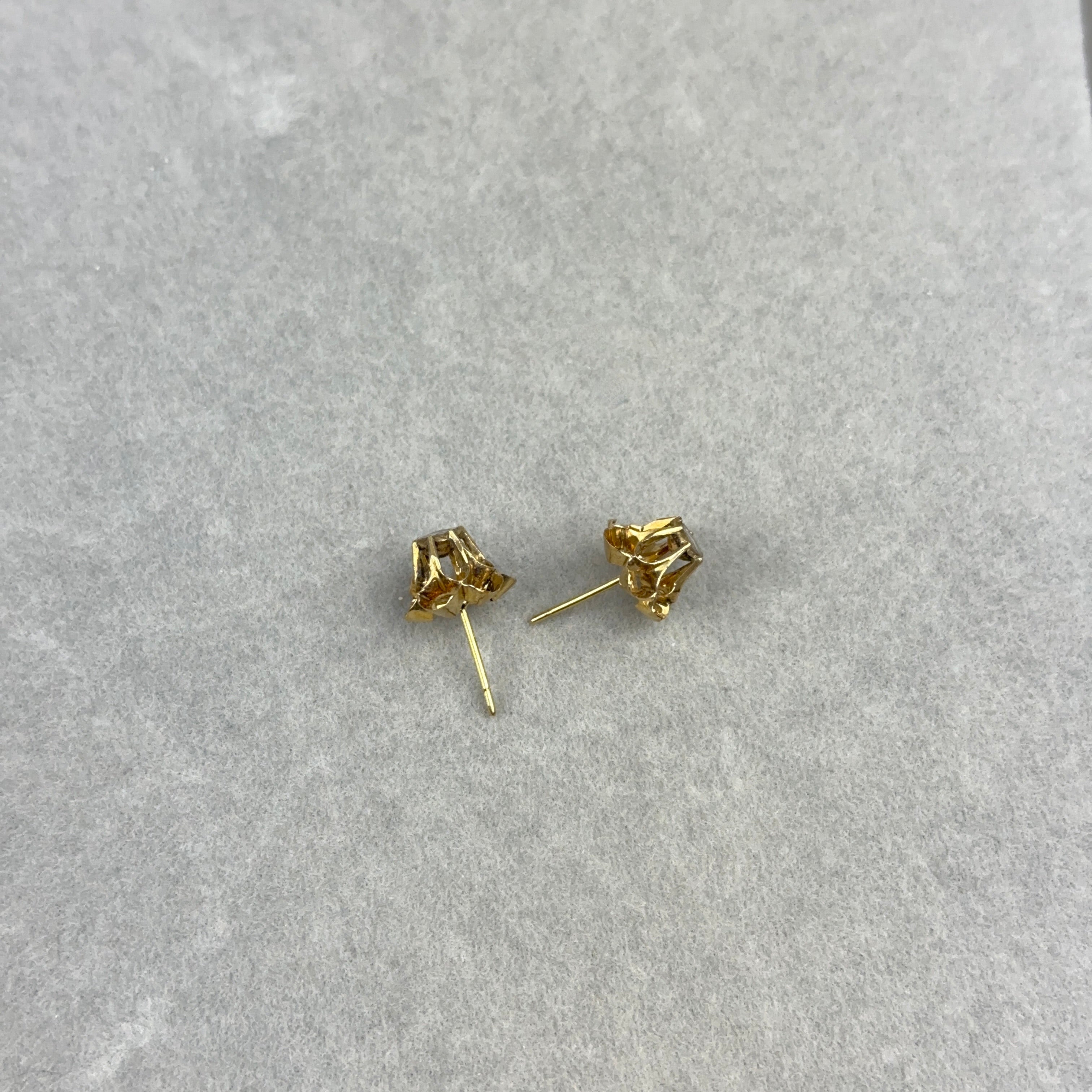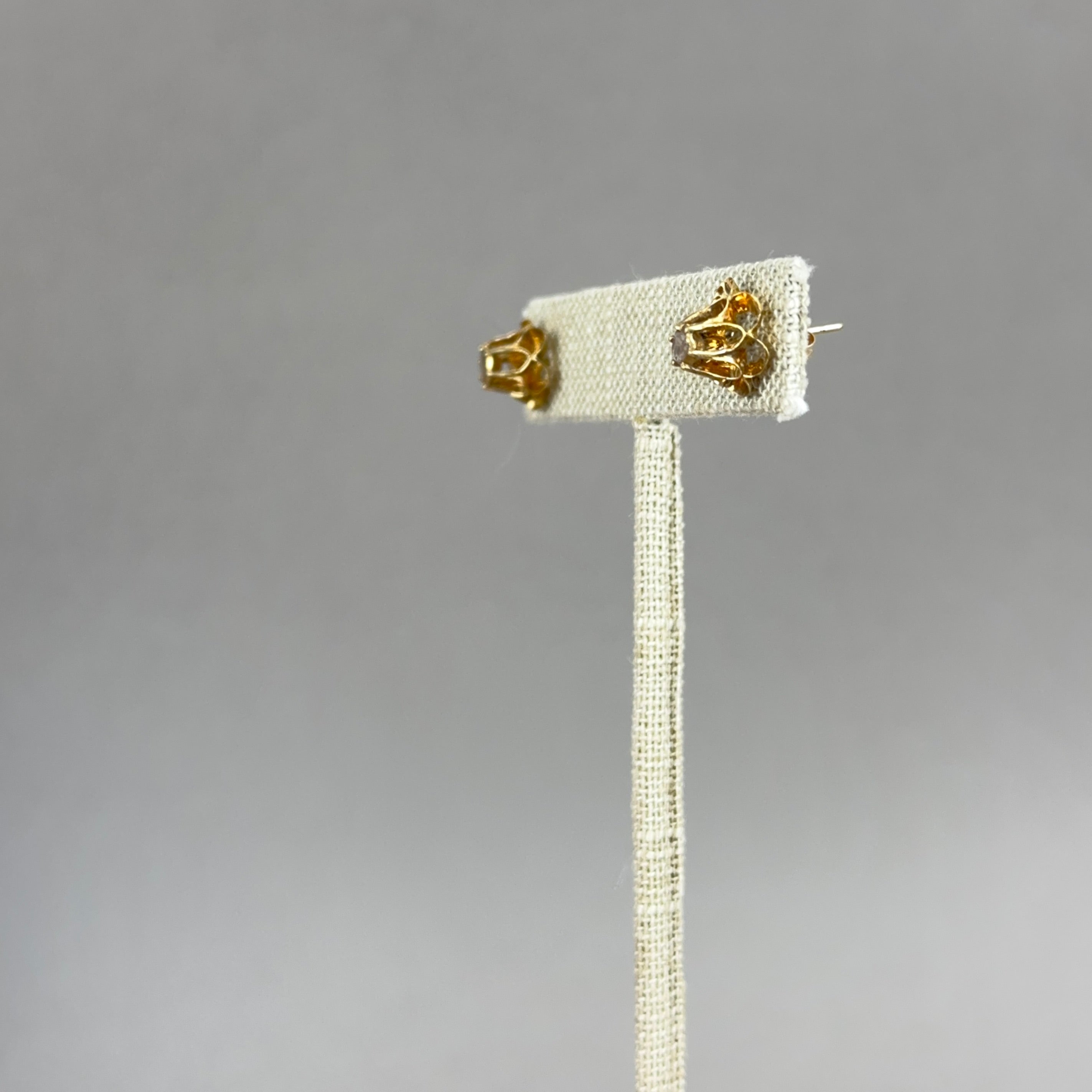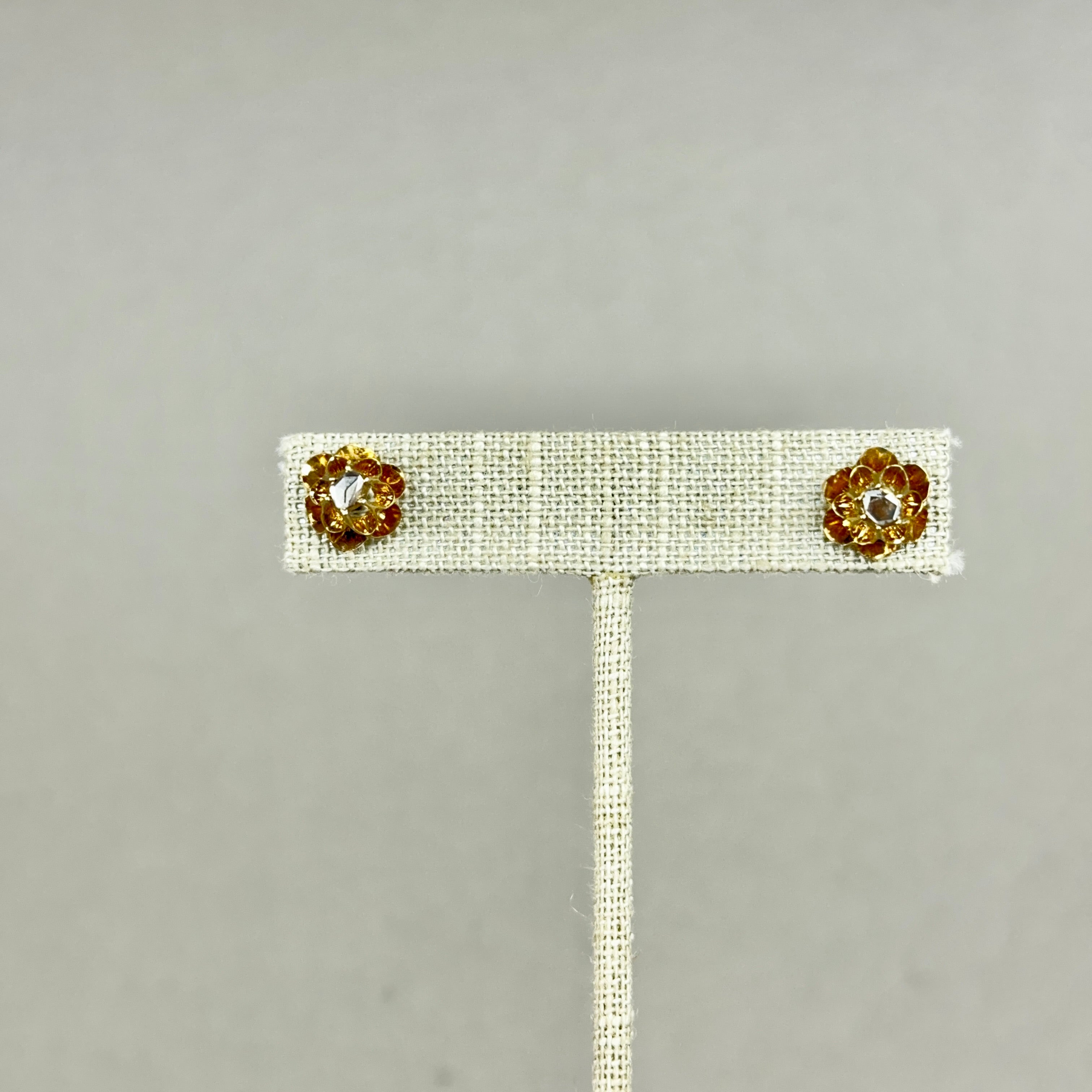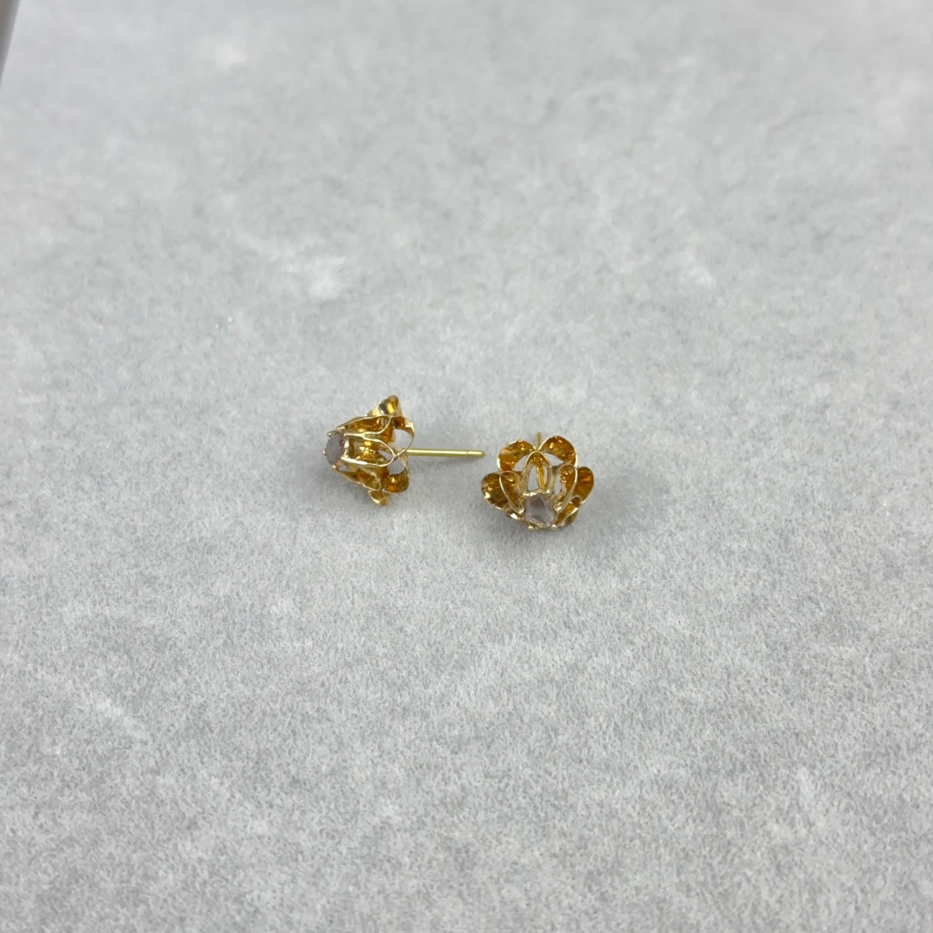These antique early Victorian stud earrings from the 1840s feature rose cut diamonds in 14k rose gold double buttercup settings.