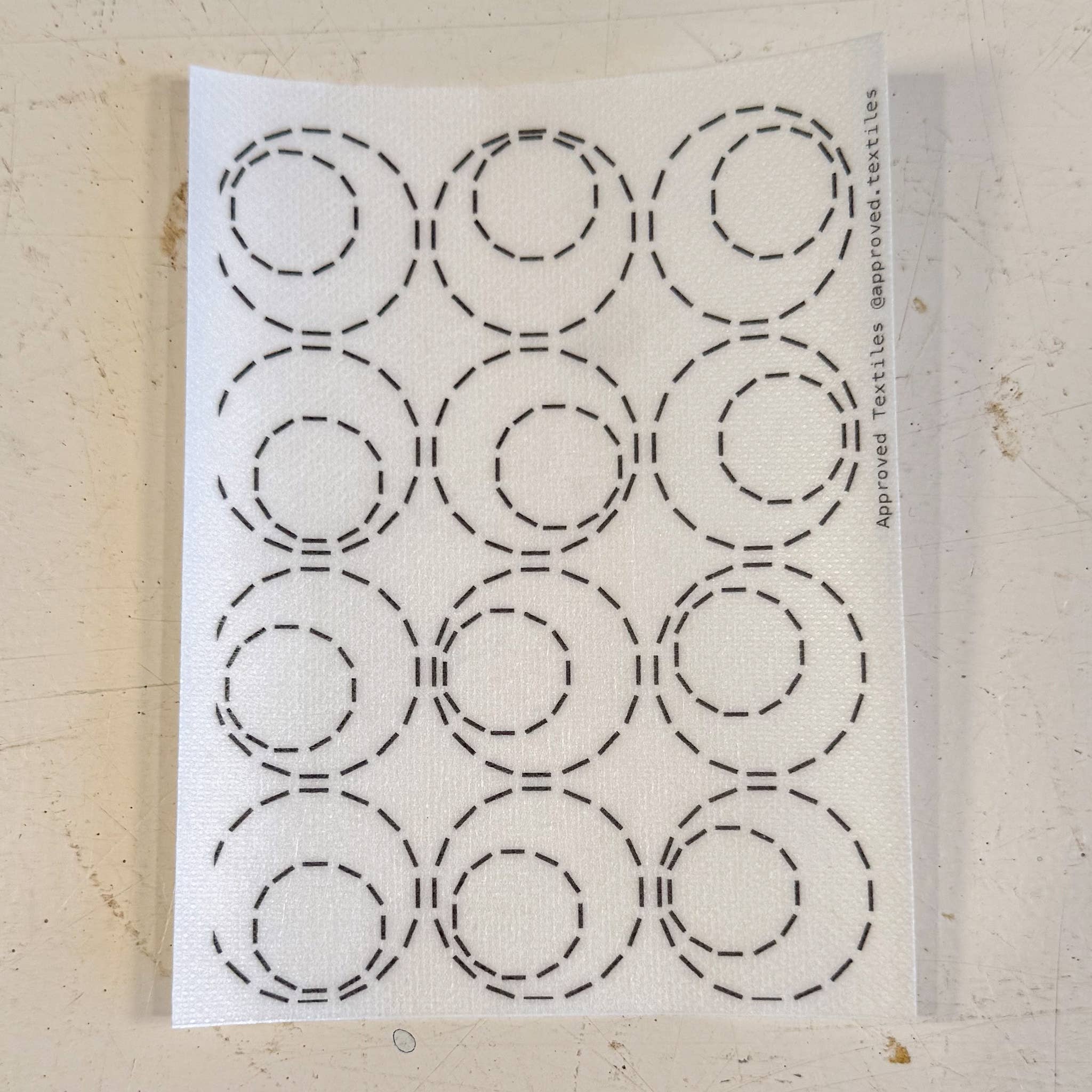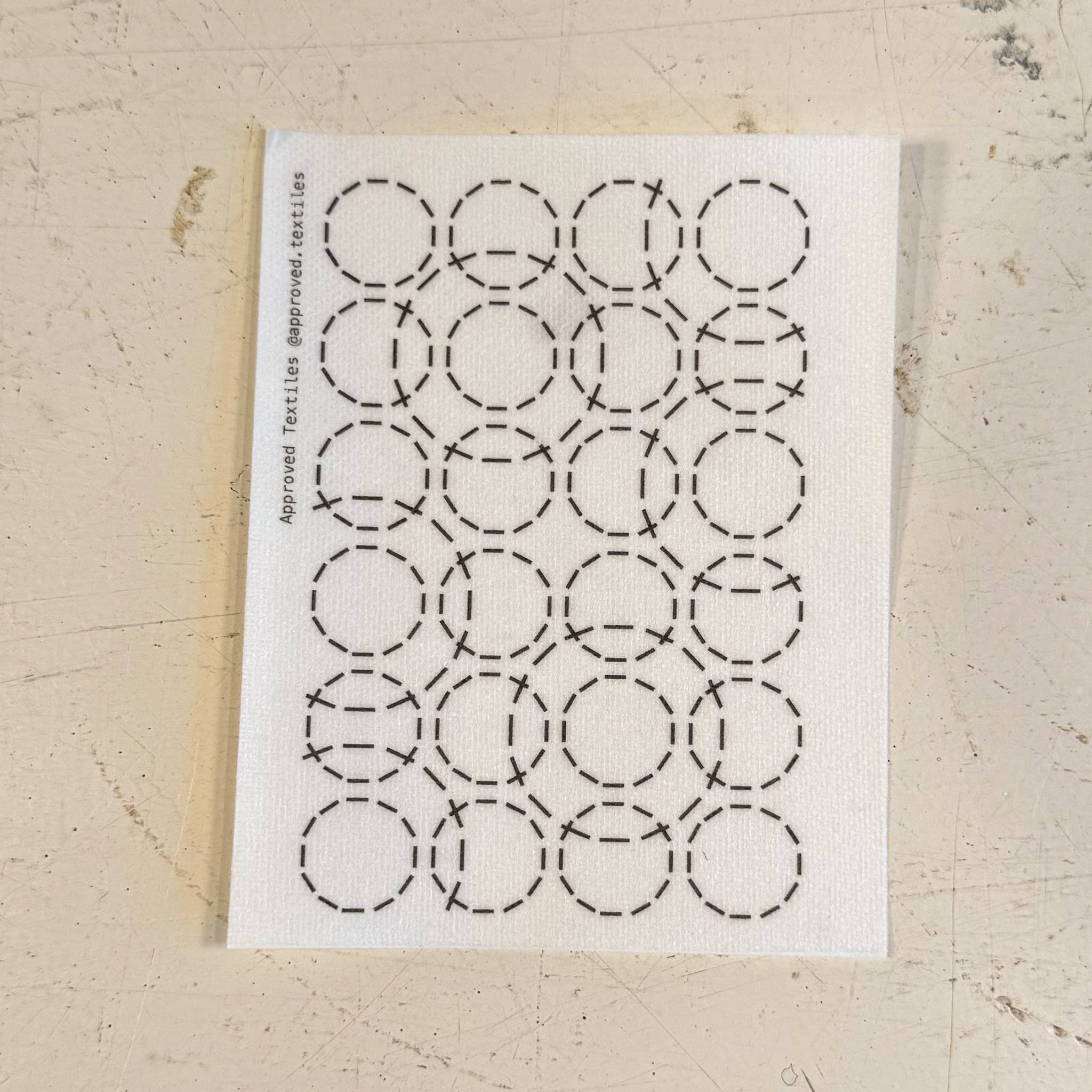 A quiet revolution. This minimalist transfer set by Approved Textiles is for those drawn to movement, rhythm, and the grace of circular paths. Inspired by orbits and planetary pull, these designs bring gentle curvature to your visible mending or decorative embroidery.