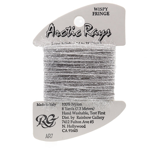 This is Arctic Rays from Rainbow Gallery in color 07 Silver. A high-texture accent thread - excellent for beards, fur, or garlands! 1 or 2 ply on 13 mesh, 1 ply on 18 mesh.