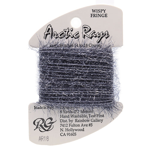 This is Arctic Rays from Rainbow Gallery in color 18 Kitty Cat Gray. A high-texture accent thread - excellent for beards, fur, or garlands! 1 or 2 ply on 13 mesh, 1 ply on 18 mesh.