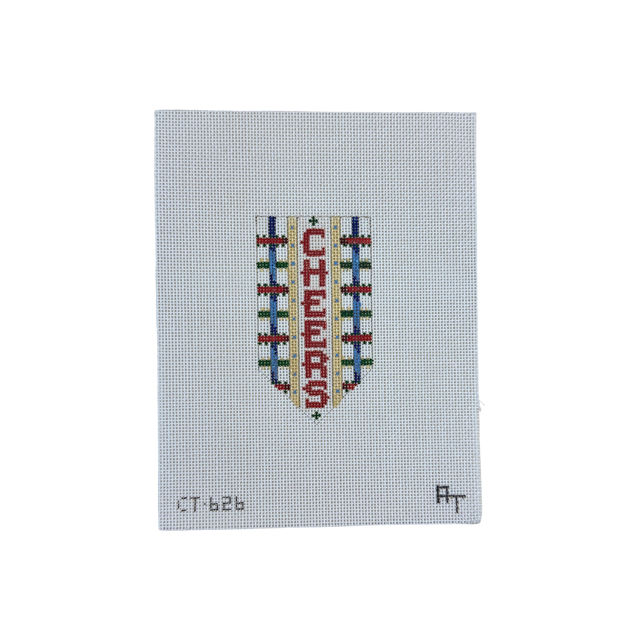 This hand painted needlepoint canvas from Associated Talents features a colorful banner with Cheers on it.
