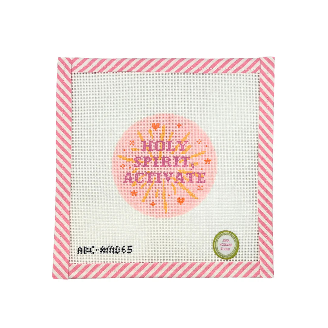 This is a hand painted needlepoint canvas by Anna McKenzie Studio from Atlantic Blue Canvas featuring the phrase "holy spirit activate" in shades of pink and orange.