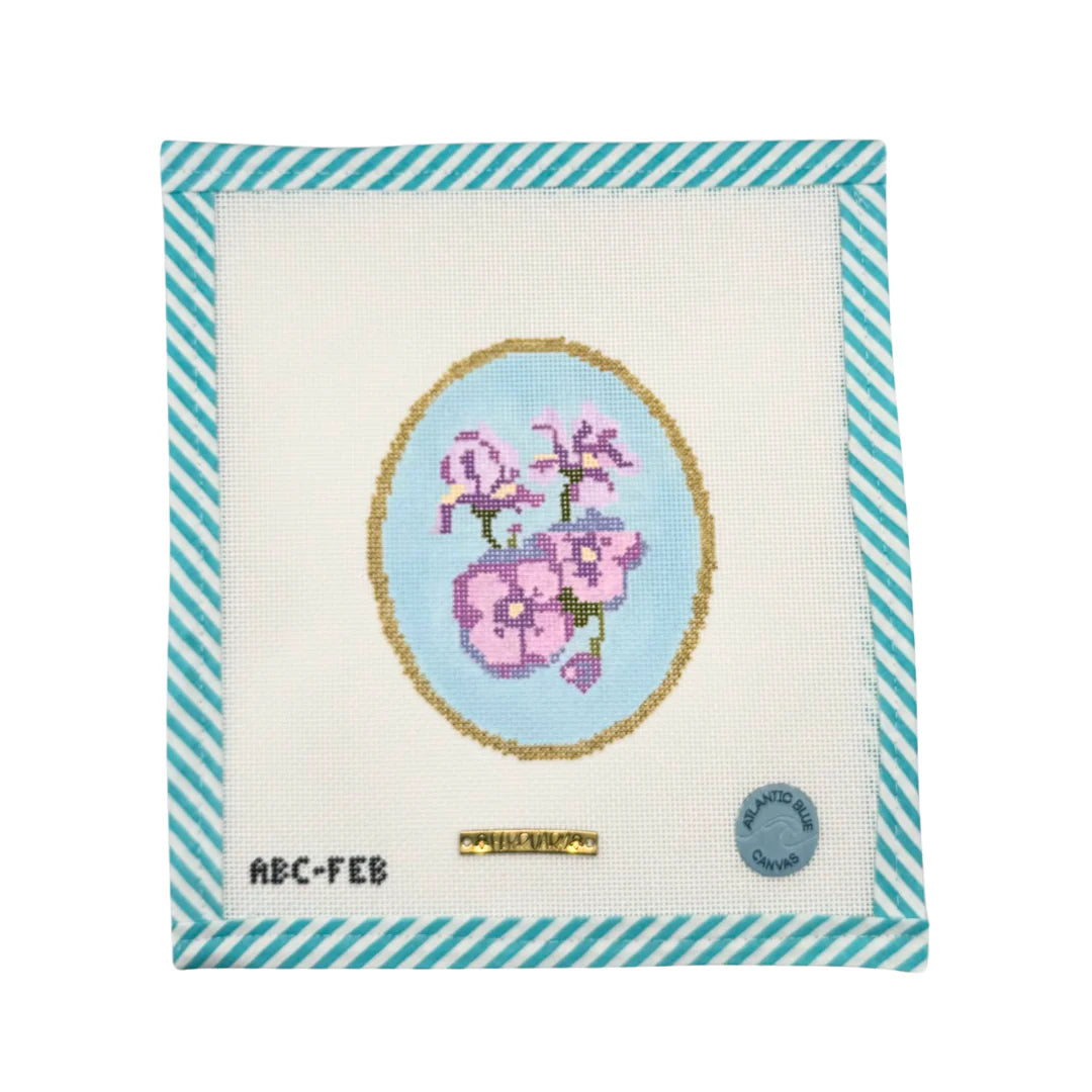 This is a hand painted needlepoint canvas from Atlantic Blue Canvas. It features the flowers of February, the violet and the iris.