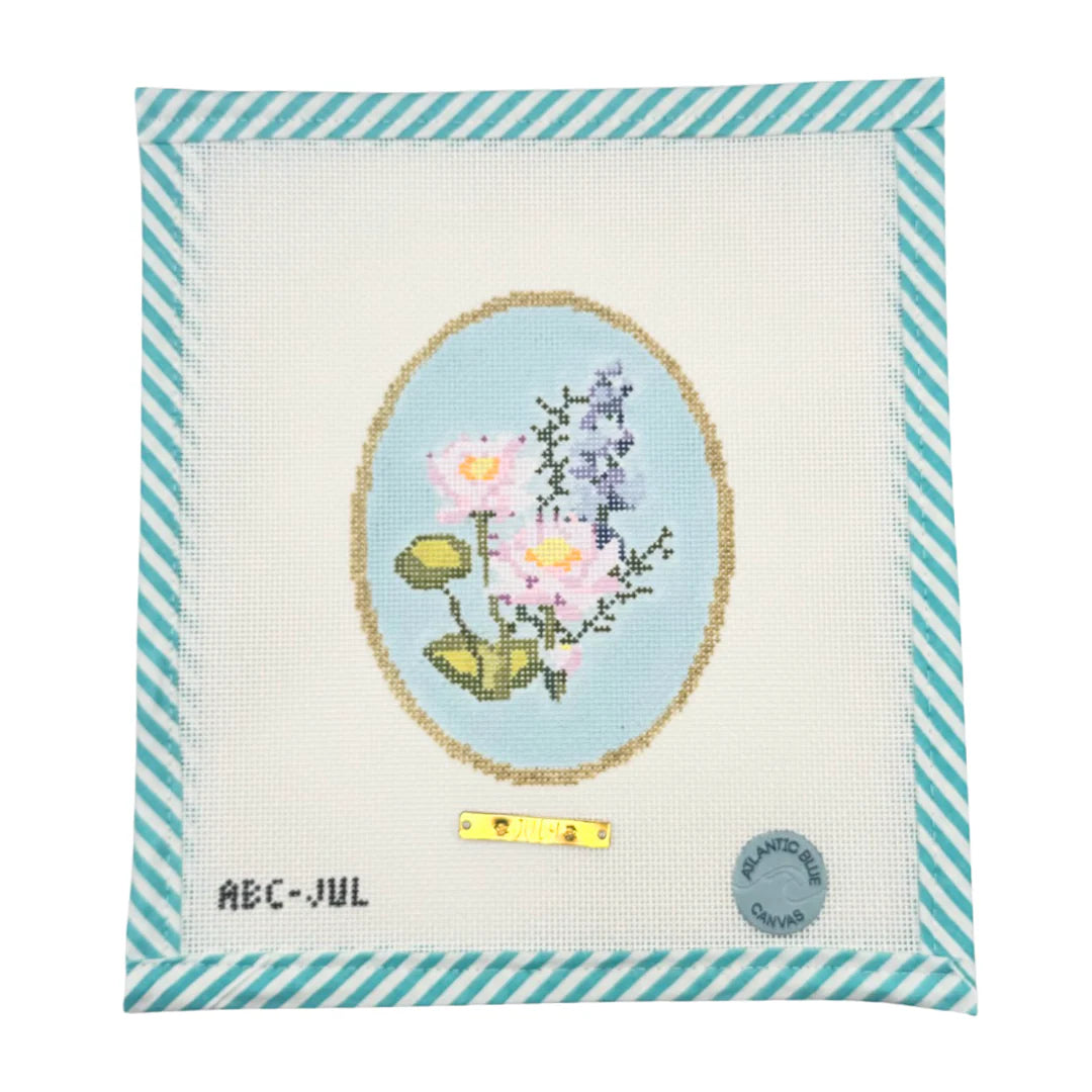 This is a hand painted needlepoint canvas from Atlantic Blue Canvas. It features the flowers of July, the water lily and the larkspur.