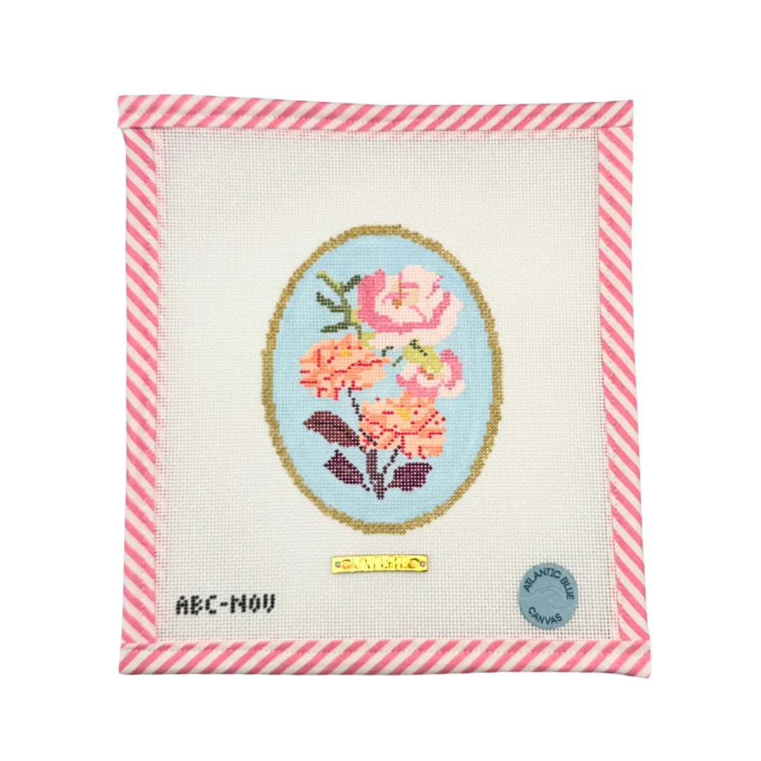 This is a hand painted needlepoint canvas from Atlantic Blue Canvas. It features the flowers of November, Chrysanthemums and Peonies.