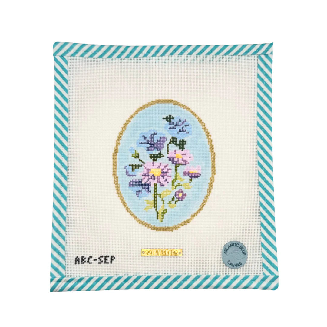 This is a hand painted needlepoint canvas from Atlantic Blue Canvas. It features the flowers of September, the Aster & the Morning Glory.